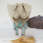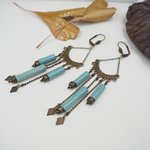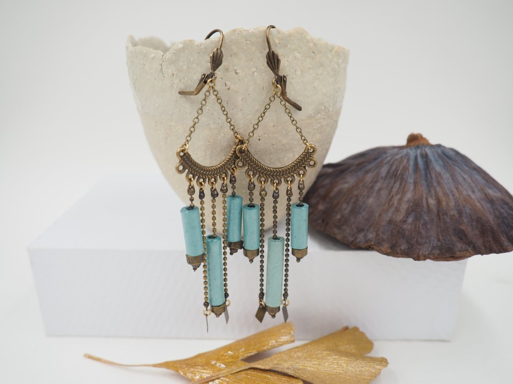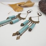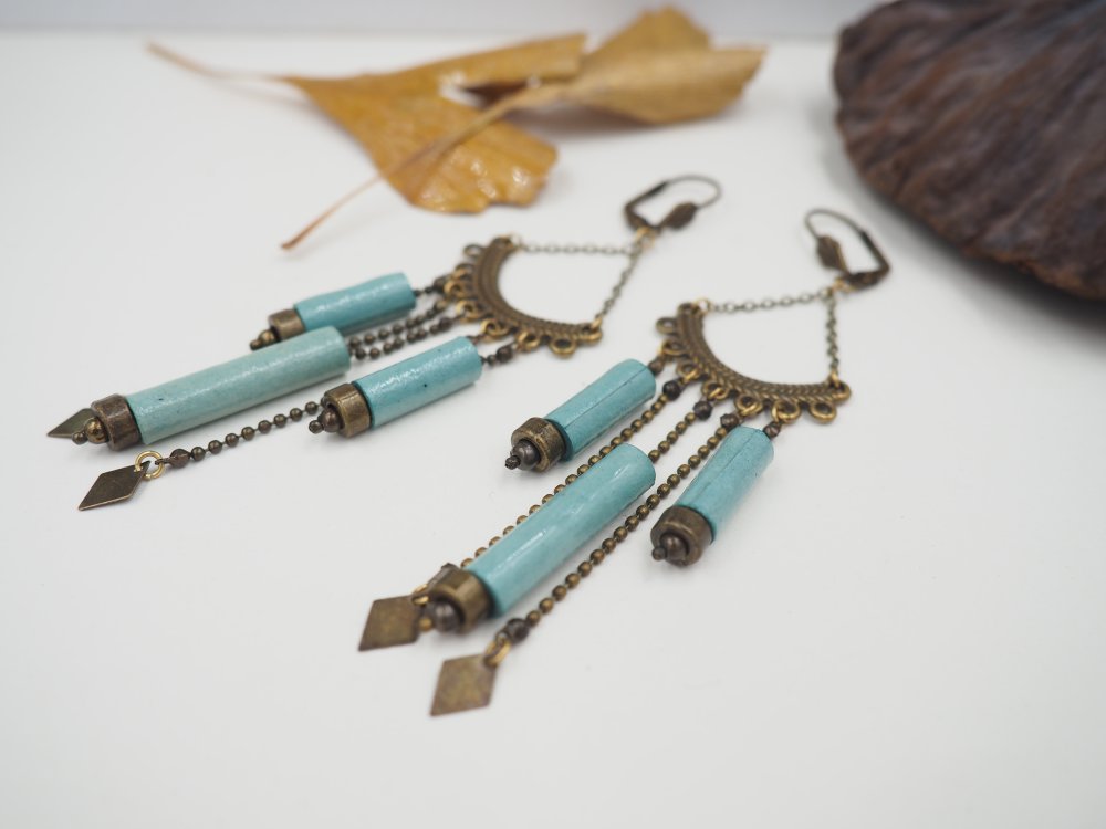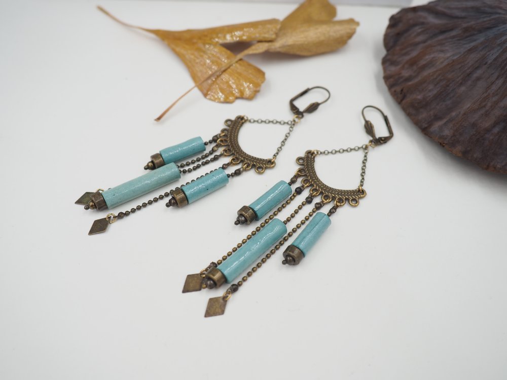 Jolies boucles composées de 3 perles de papier chiffon d'un bleu clair pastel ! Chaines à billes et détail géométrique pour un look ethnique !