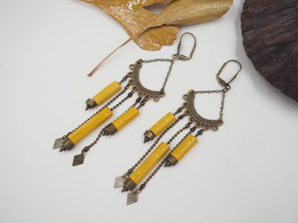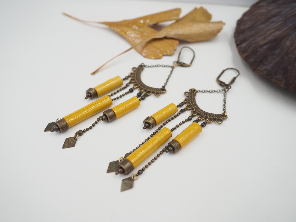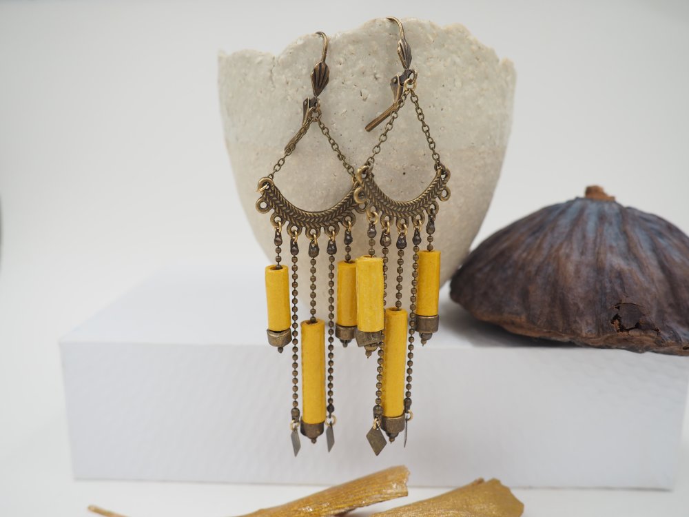 Jolies boucles composées de 3 perles de papier chiffon d'un jaune lumineux ! Chaines à billes et détail géométrique pour un look ethnique !