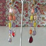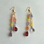 Les boucles d'oreilles sont composées de chaîne en métal doré avec des perles acrylique transparentes multicouleurs (dimension des perles 9 X 5 mm),de pendentif en formes de gouttes en verre couleur parme et d'un autre pendentif en verre rouge,et de crochets d'oreilles en métal doré.