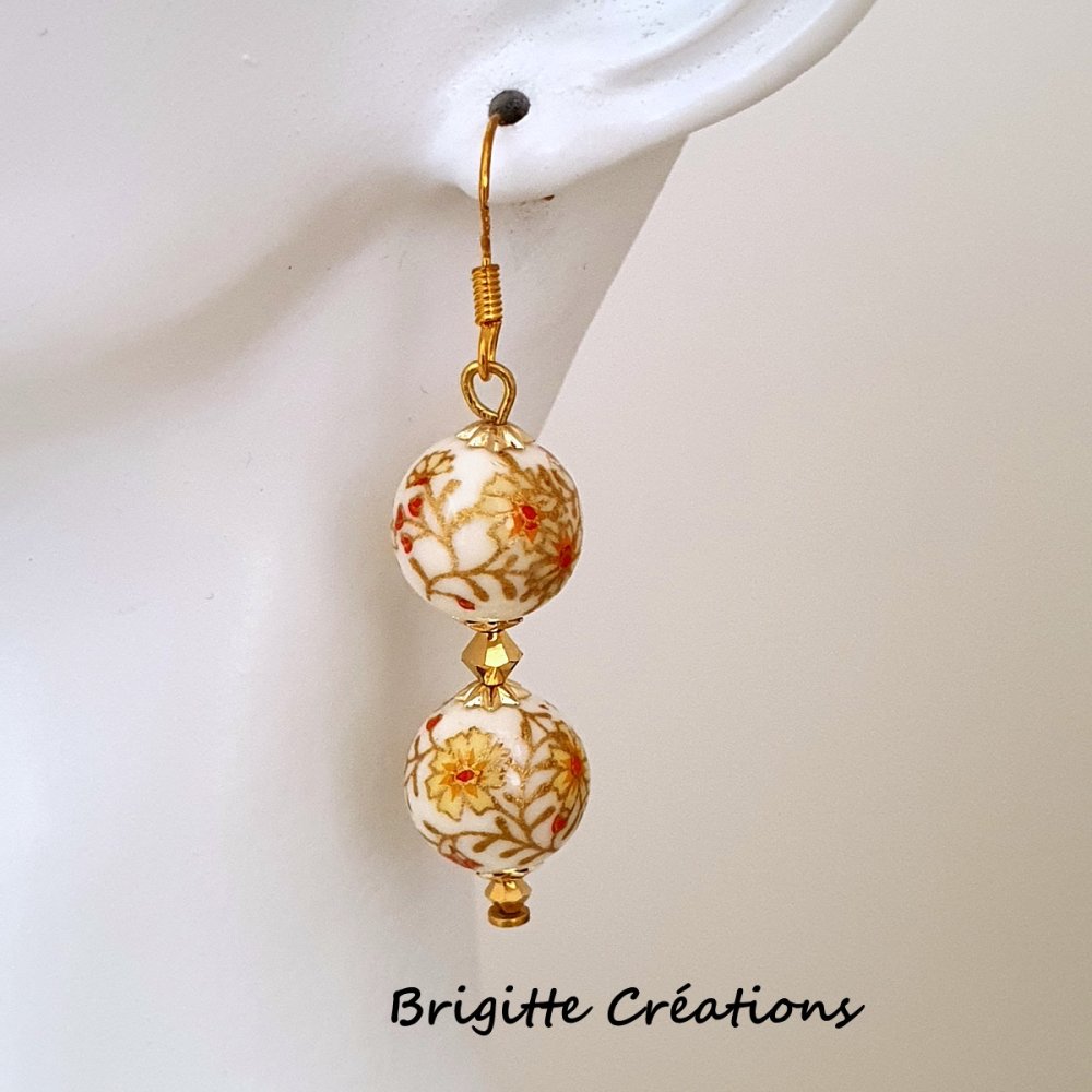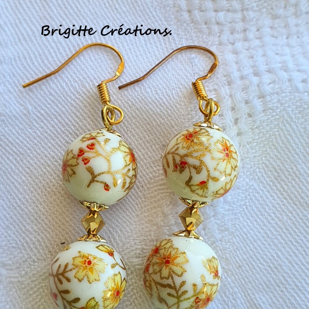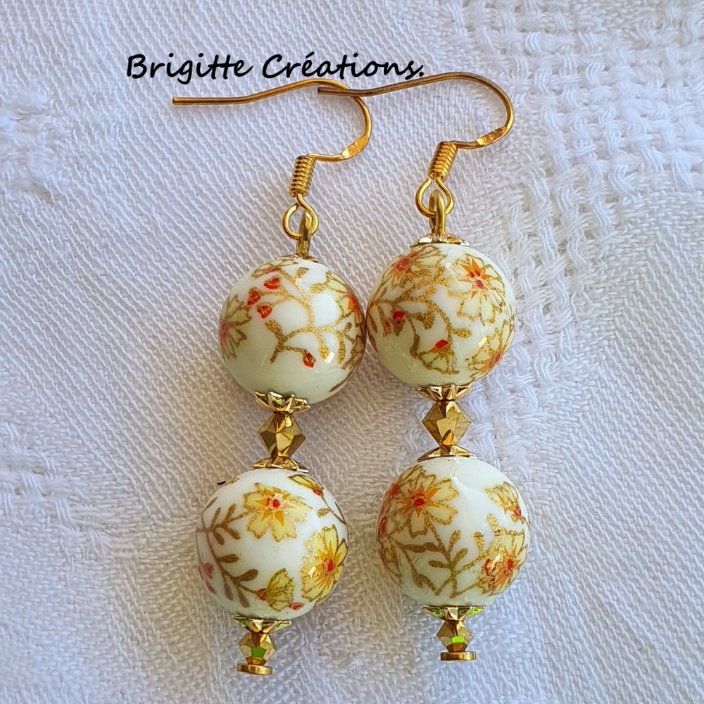 BOUCLES D'OREILLES en perles japonaises Tensha rondes blanches lignées d'or décor fleuri de 12 mm de diamètre montées sur des tiges dorées et serties de collerettes fleurs dorées.