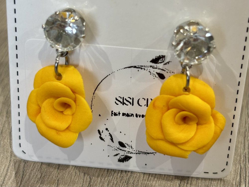 Boucles d’oreilles en pâte polymère et acier inoxydable en forme de roses jaune entièrement façonnées à la main, avec son petit strass qui l’accompagne colorées et à la fois discrète par la douceur de la rose