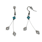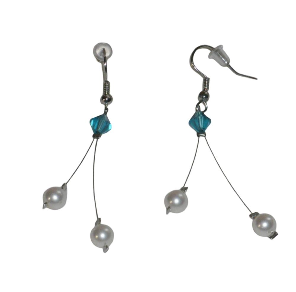 1 paire de boucles d'oreilles étincelle blanc et bleu n°1 - Bijoux mariage - Composé de ronde nacré 6 mm et de toupie 6 mm en cristal autrichien, sur fil câblé argenté, hauteur hors boucles: 4.5 cm. Garantit sans nickel.