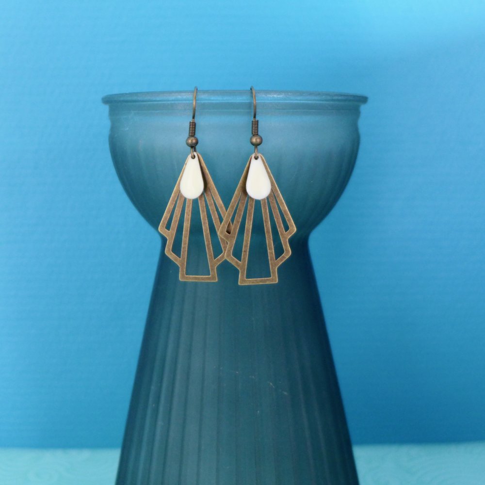 Boucles d'oreilles éventail graphique Art Déco blanc écru