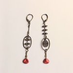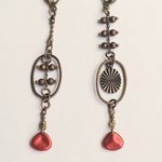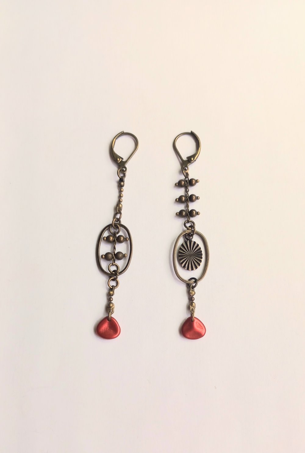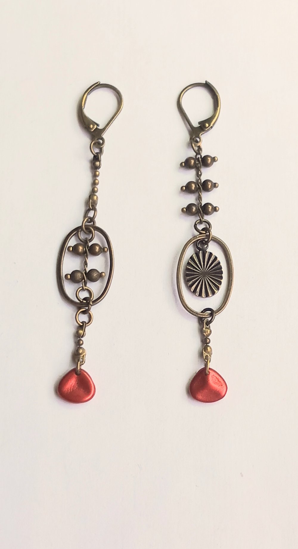 Création personnelle, modèle unique en laiton couleur bronze et perles verre tchèques couleur rouge métallisée.