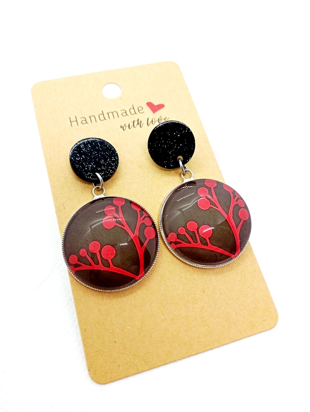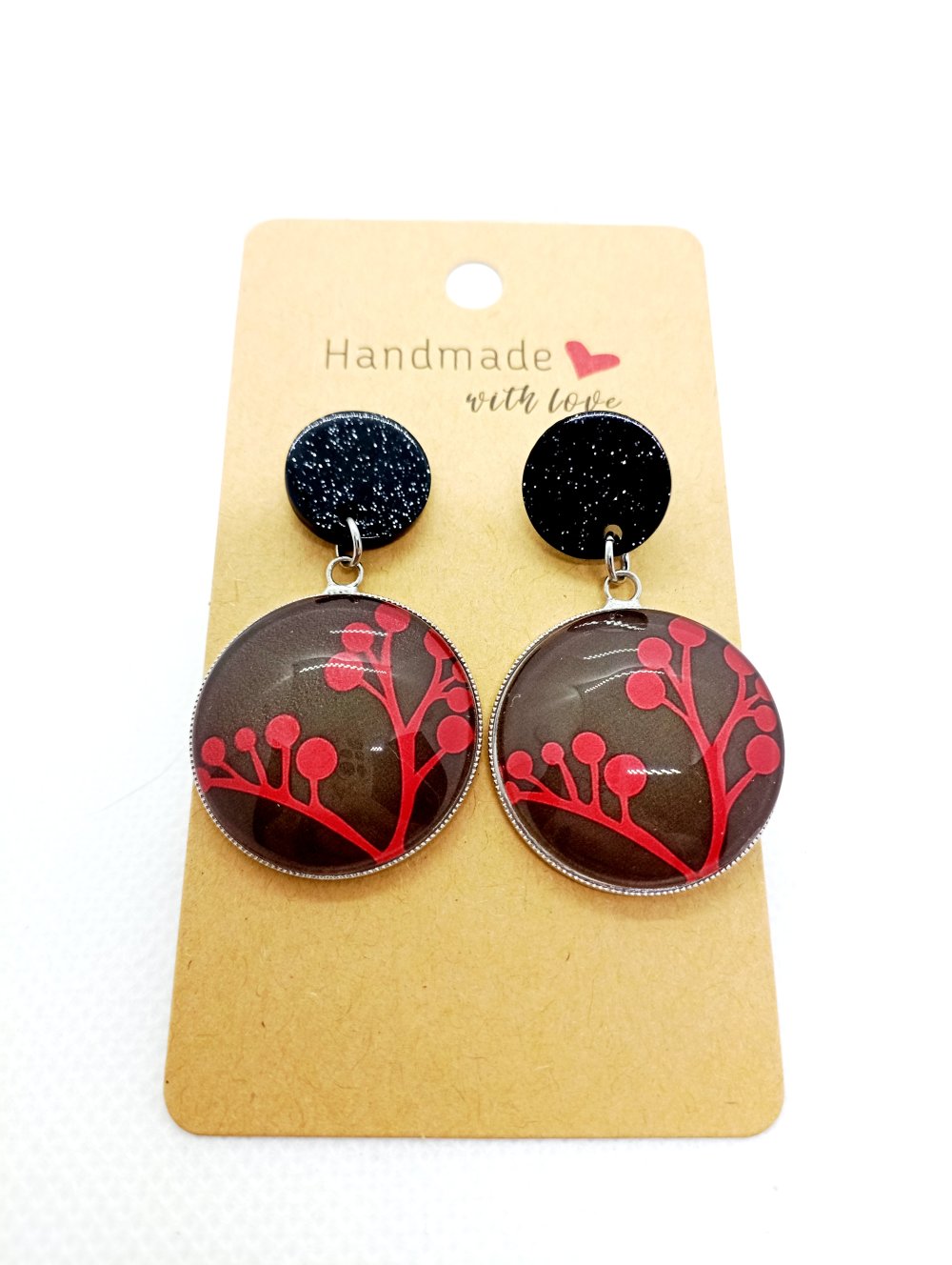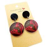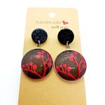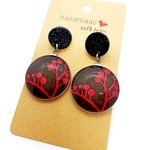 Puces d’oreilles pailletées noires en acrylique avec pendentifs recouverts de cabochons en verre "feuillages rouges sur fond noir".