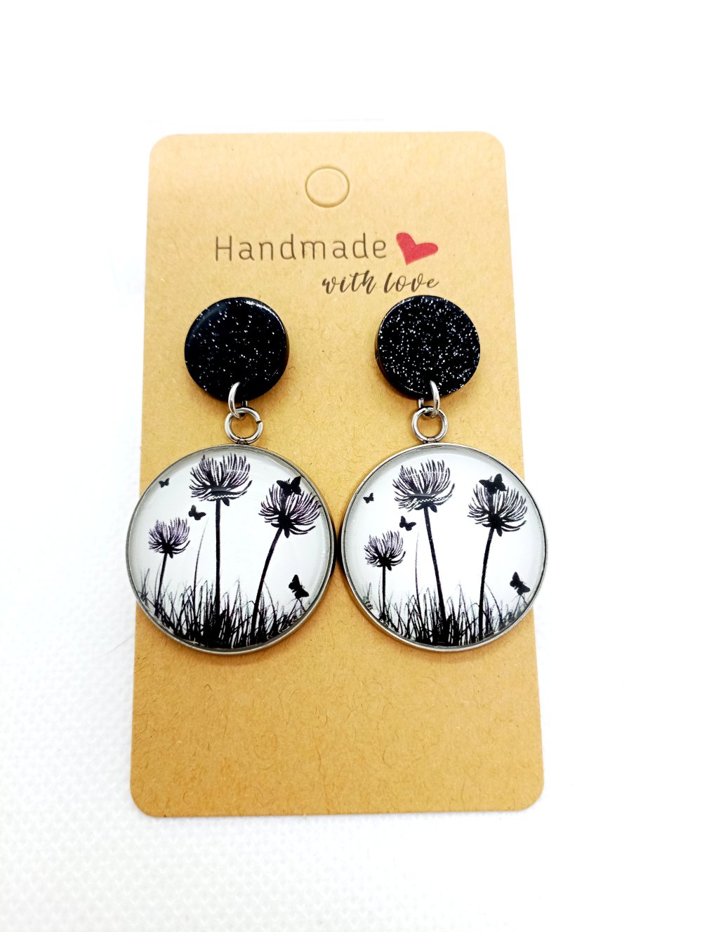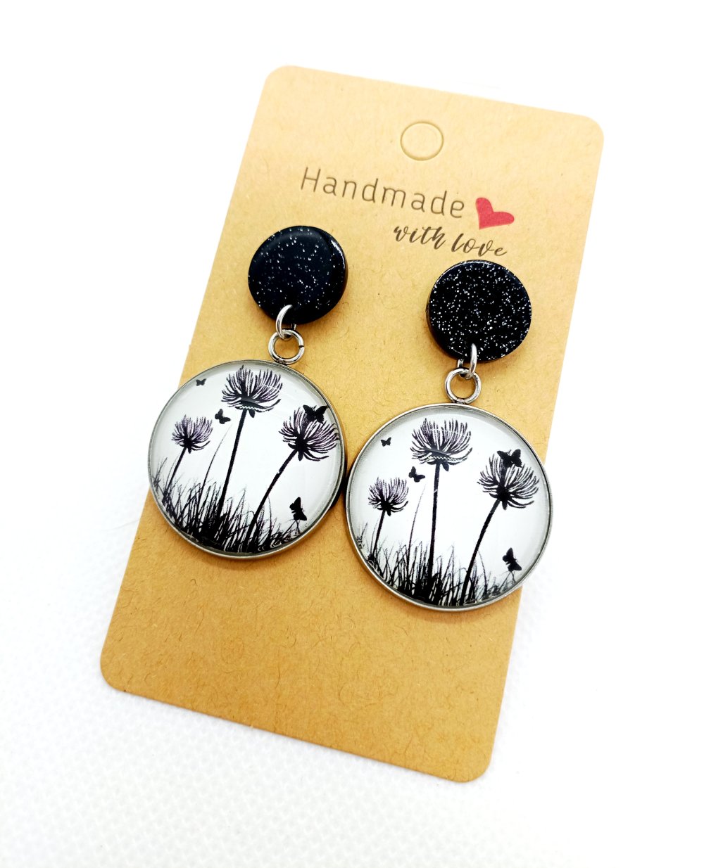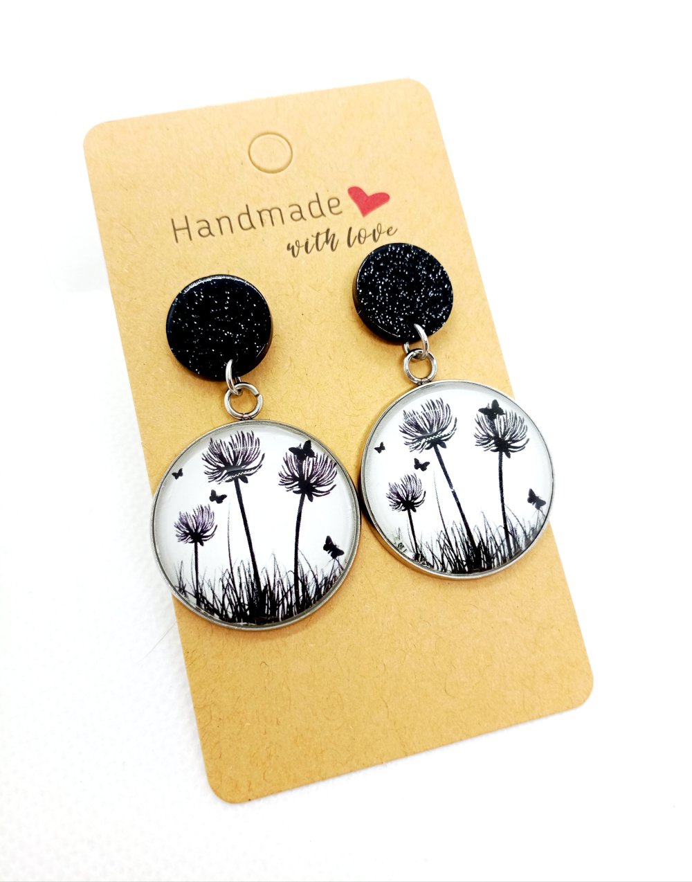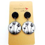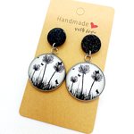 Puces d’oreilles pailletées noires en acrylique avec pendentifs recouverts de cabochons en verre "feuillages noirs sur fond blanc".