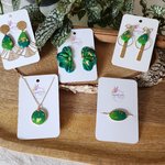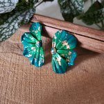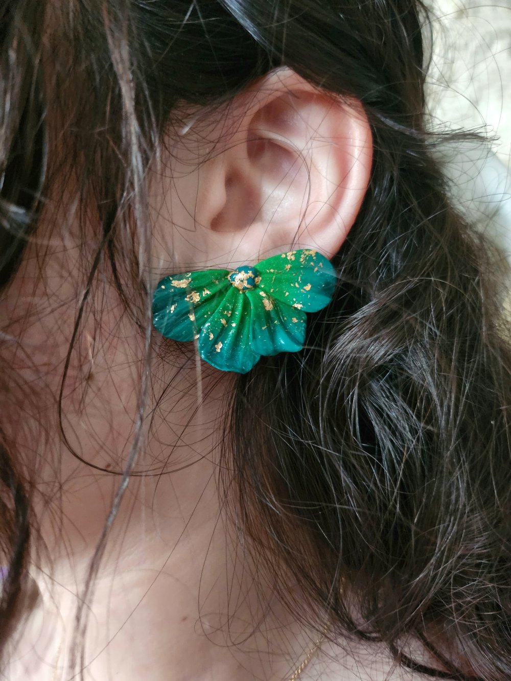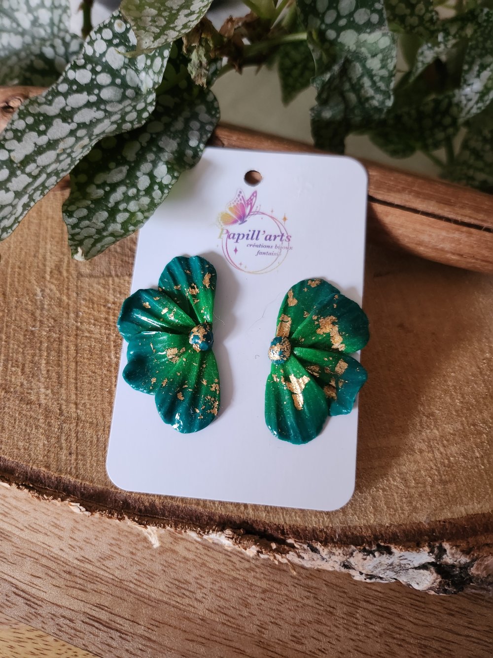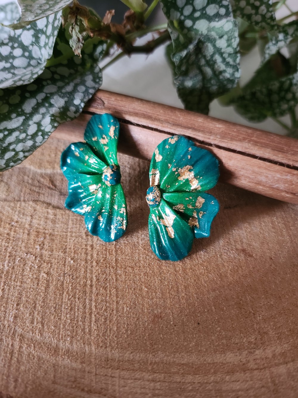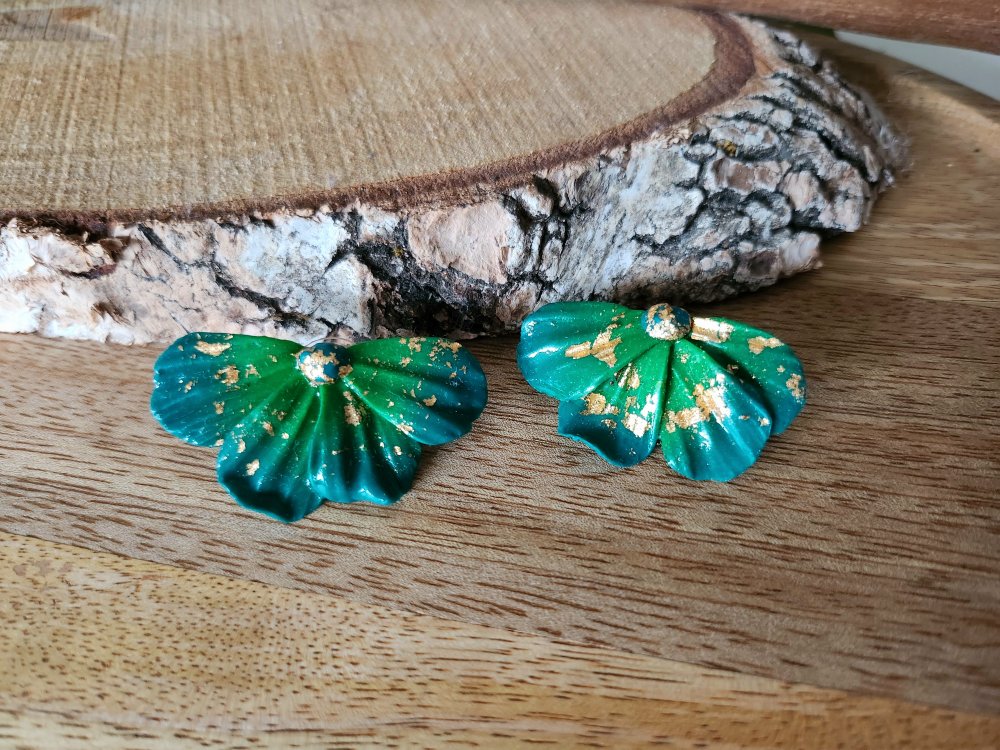 Boucles d'oreilles faites mains en pate polymère en dégradé de deux verts ainsi que des feuilles d'or.