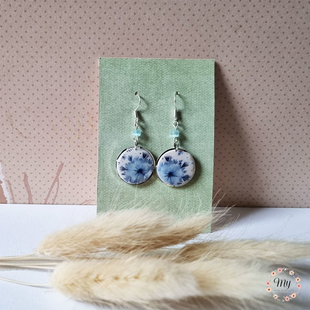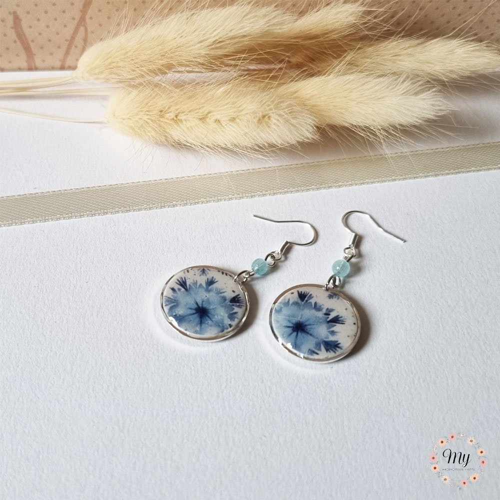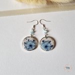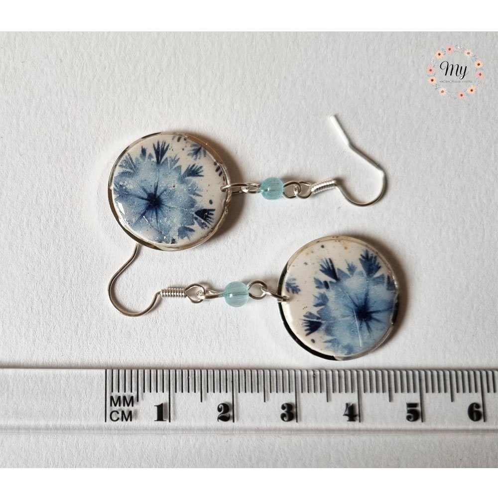 boucles d'oreilles en argile polymère et résine entièrement conçu à la main, flocons, bleu et blanc.