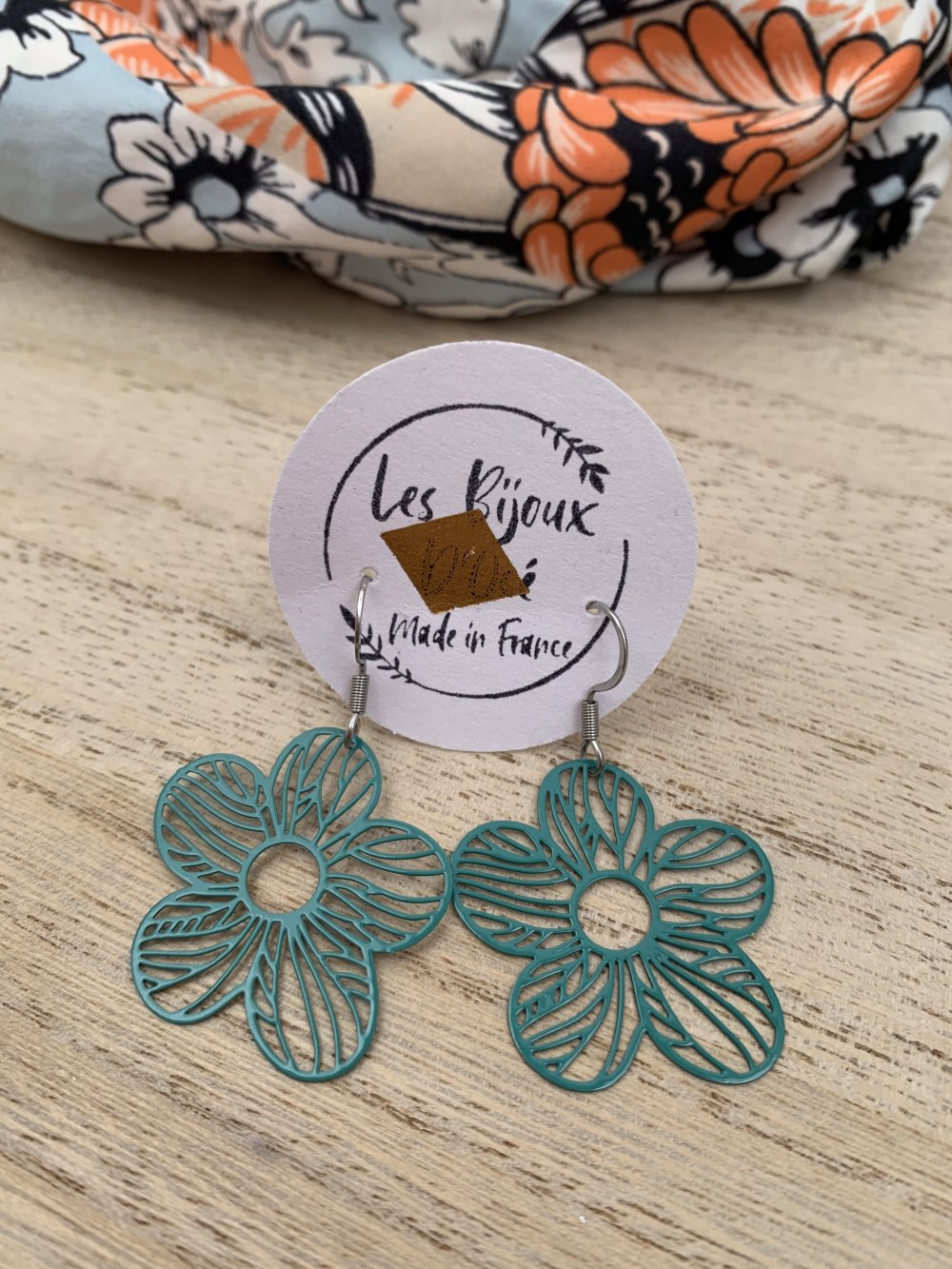 Boucles d’oreilles en acier inoxydable, légères, estampe bleue en forme de fleur.