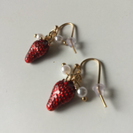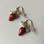 Boucles d'oreilles avec petites fraises émaillées et perles blanches
