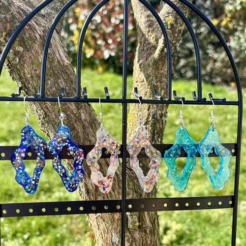 Cette forme rappelle les géodes de pierres précieuses, elle m’a beaucoup inspirée. J’ai ajouté à la résine des paillettes multicolores, pour mettre de la couleur dans nos vies 😍 Chaque paire est un modèle unique !