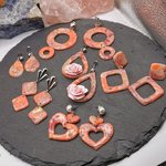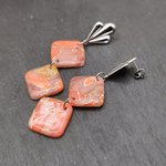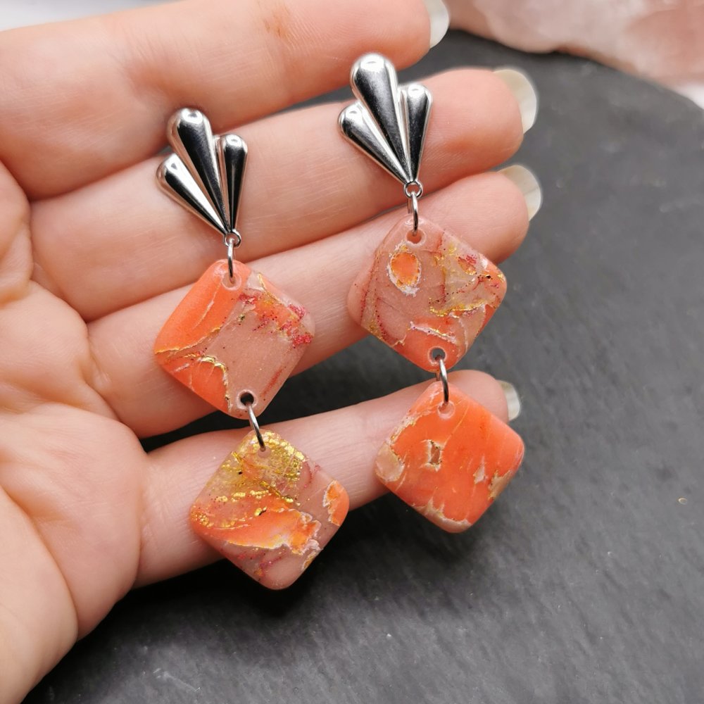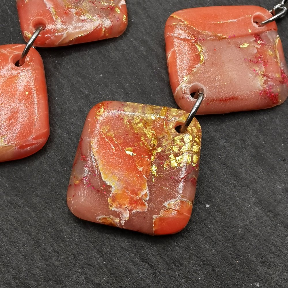 - Boucles d'oreilles en pâte polymère transparente, corail, rouge et or aux formes géométriques.