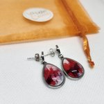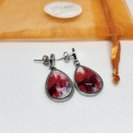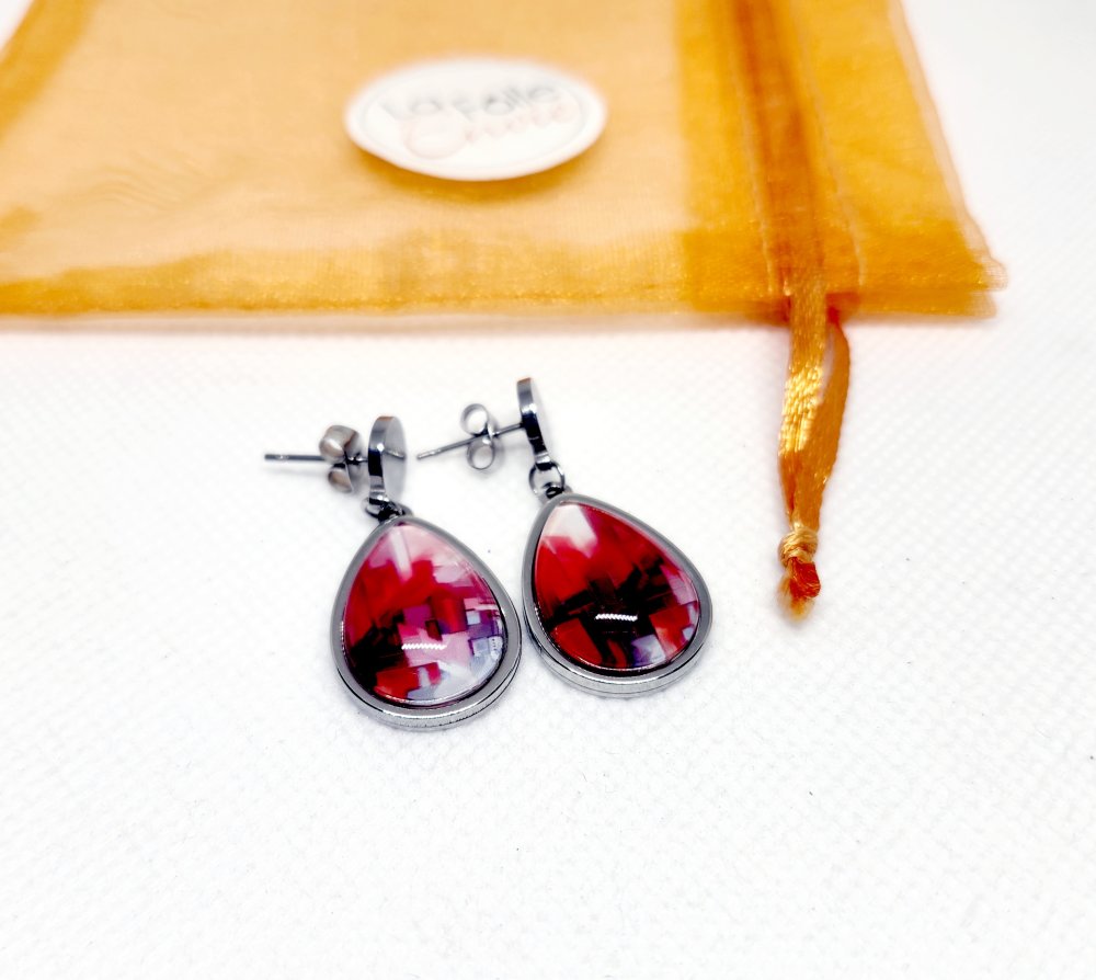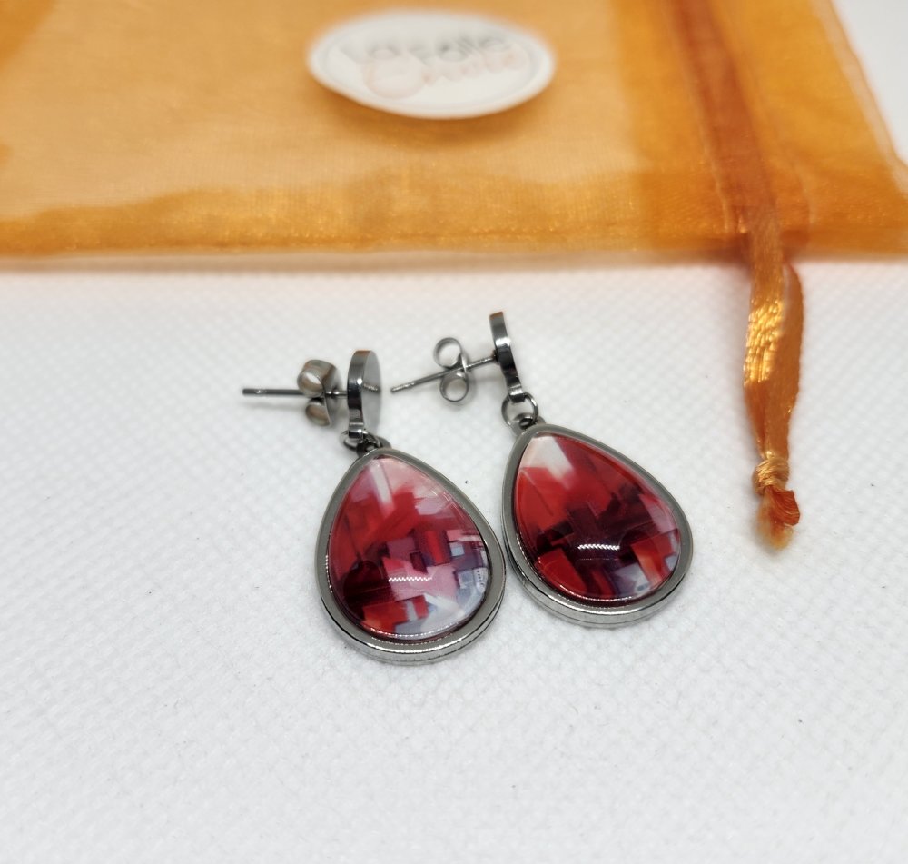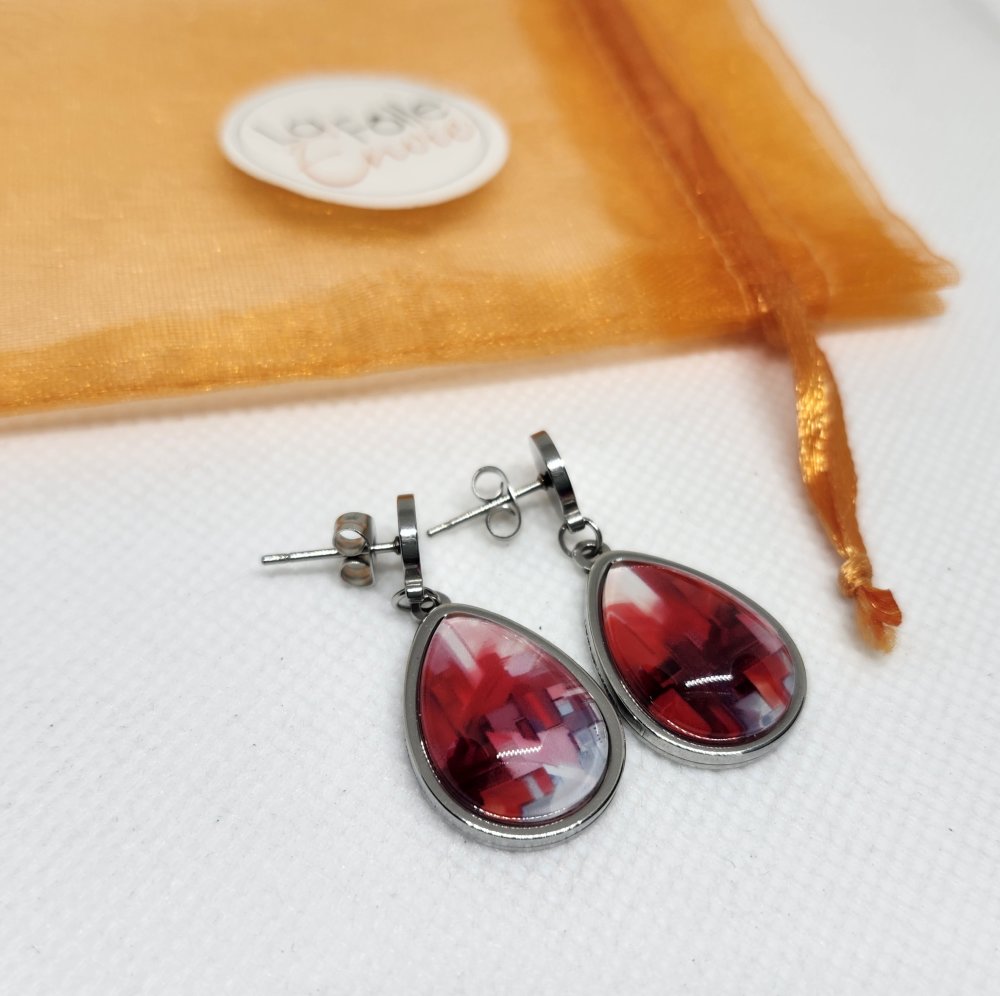Je vous propose une de mes créations. Jolie paire de boucles d'oreilles goutte d'eau pendantes dépareillées en acier inoxydable et cabochon verre 13x18mm. Motif art abstrait rouge. PIÈCE UNIQUE