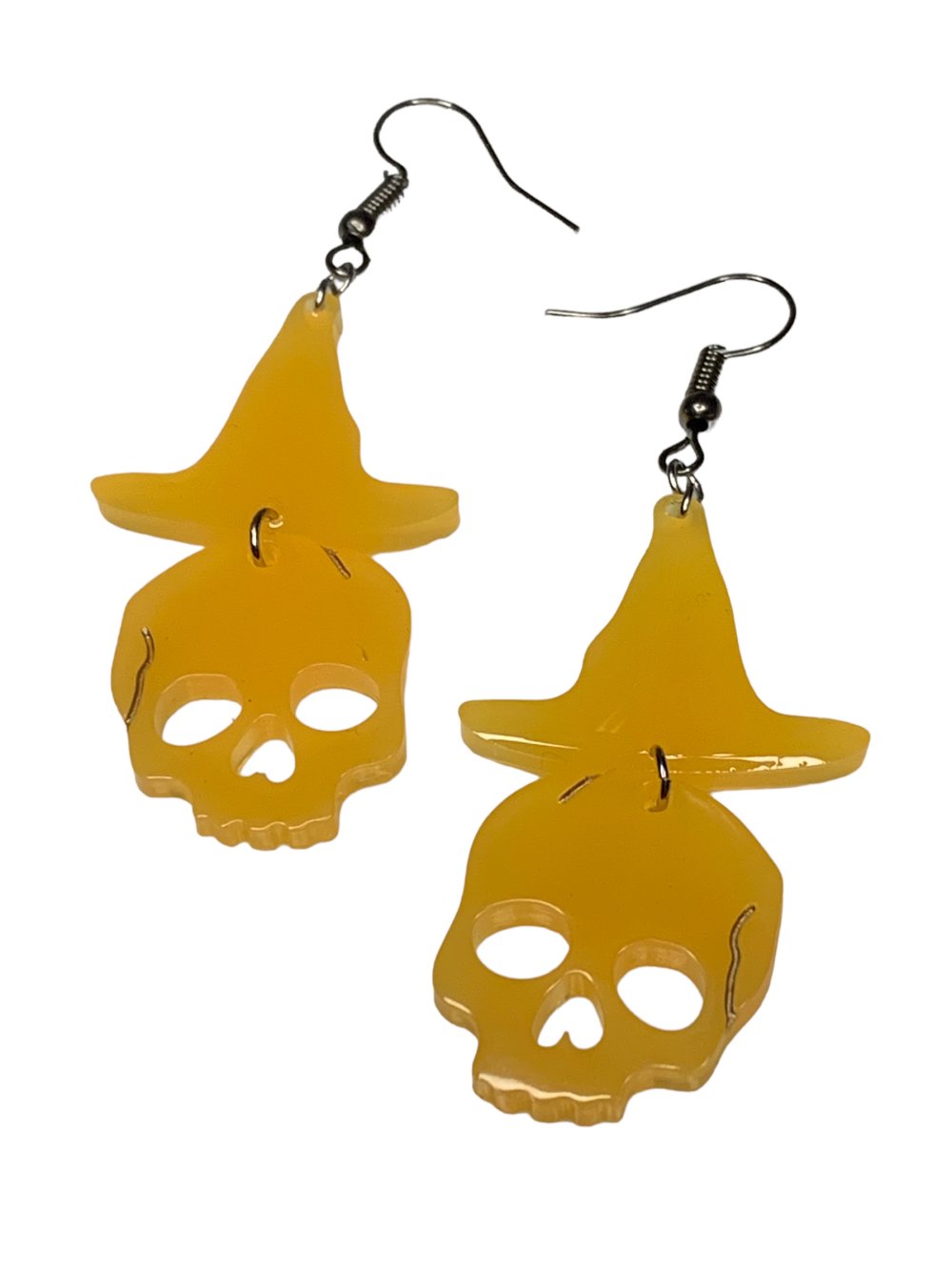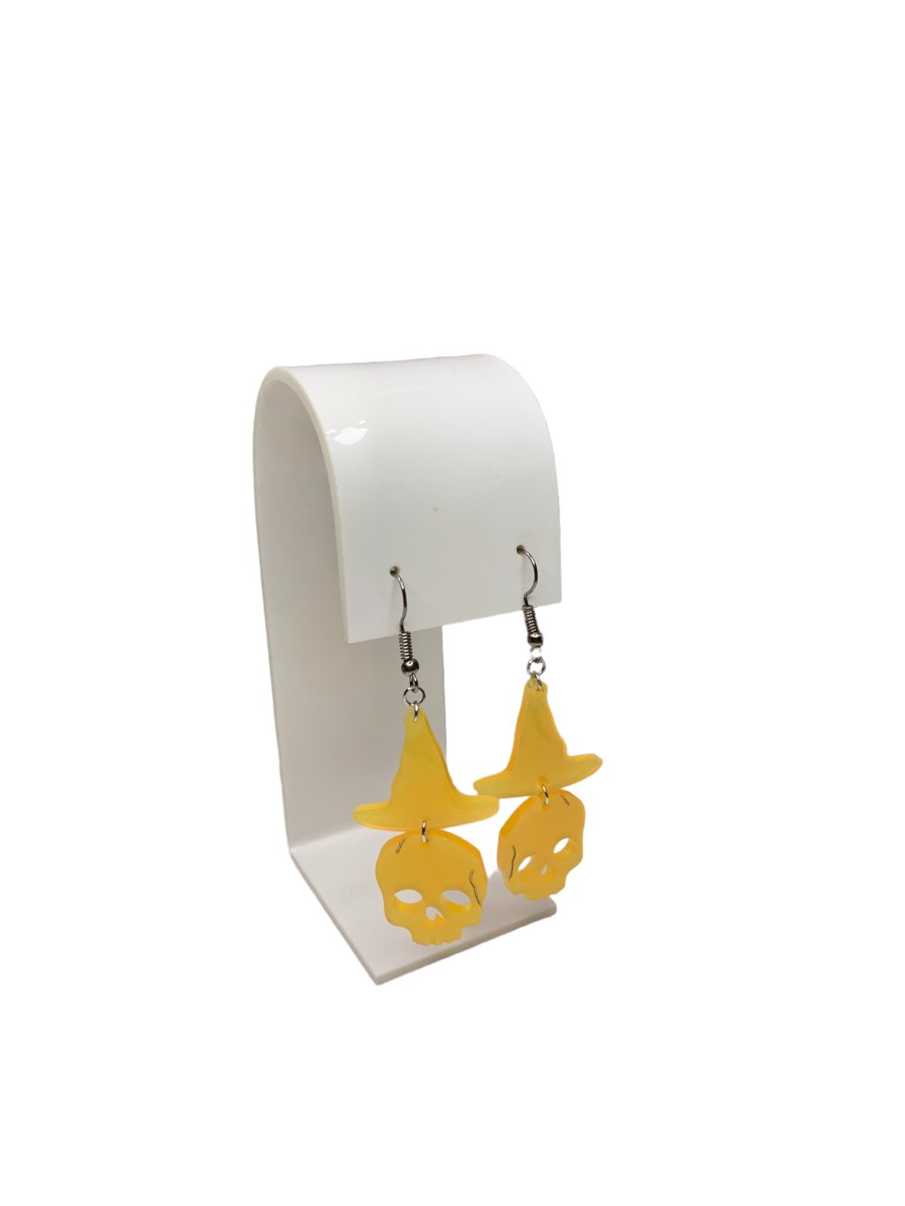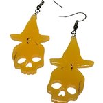 Boucles d’oreilles tête de mort et chapeau de sorcière en résine orange phosphorescente. Fait main, légères et lumineuses, elles brillent dans le noir pour un look ensorcelant à Halloween.