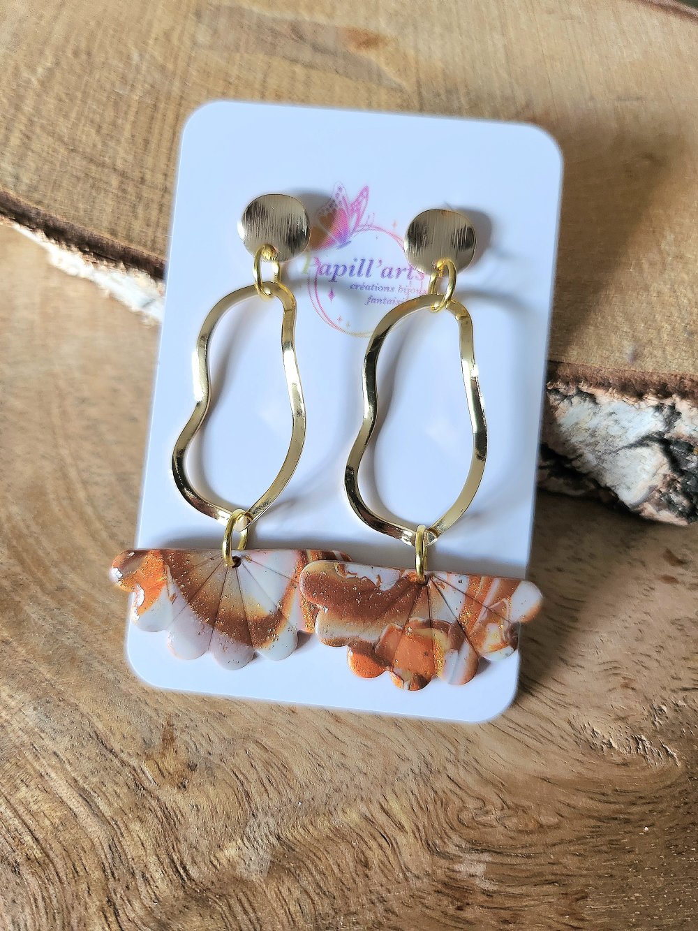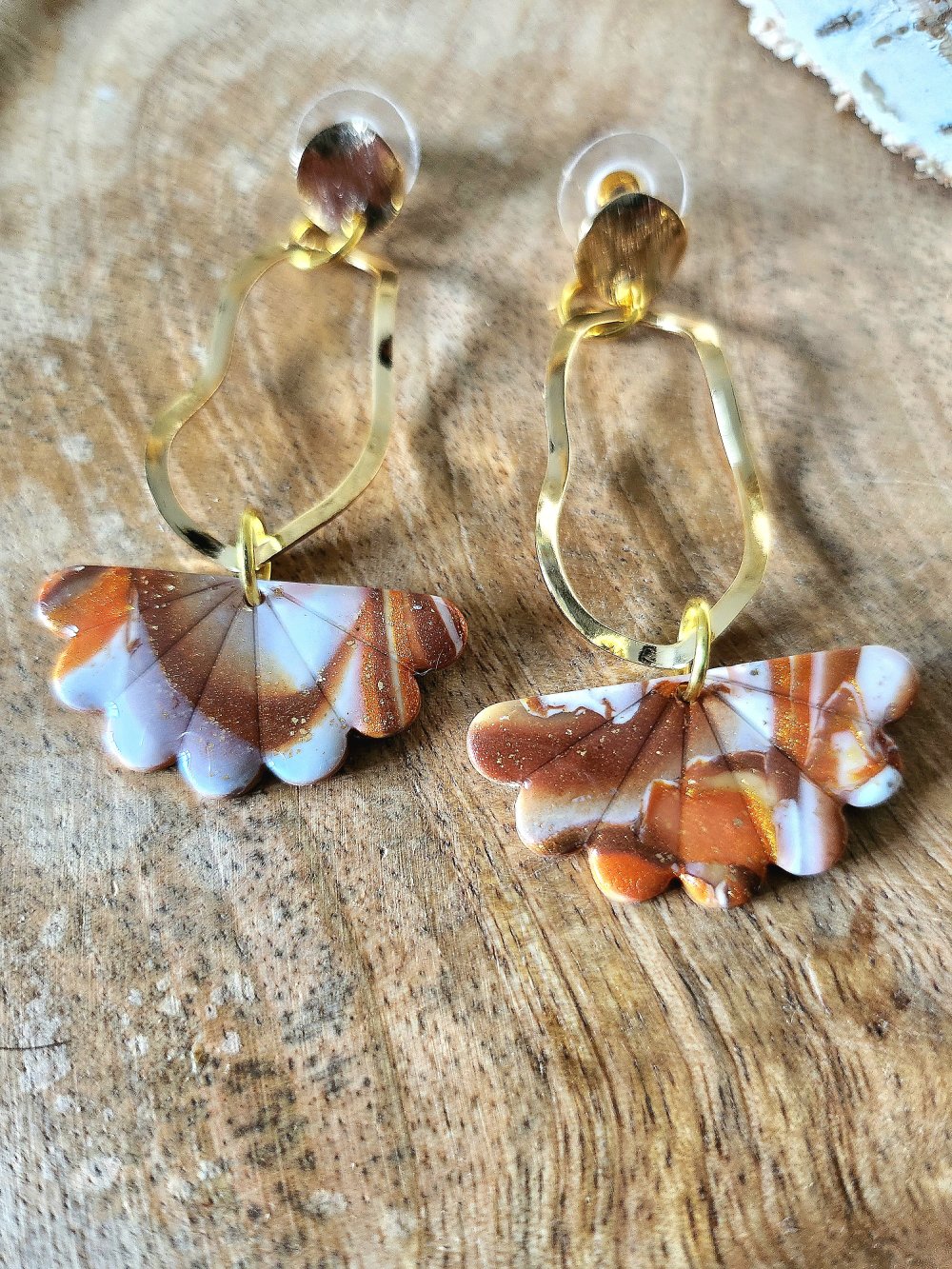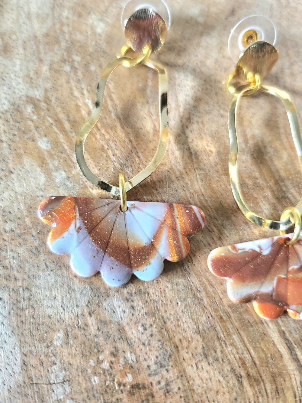 Boucles d'oreilles "horizon" faite mains en pate polymère pour la partie coloré et nuancé d'orange, blanc, marron. Le reste des pièces est en plaqué or (sauf les anneaux en métal doré simple).