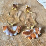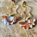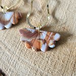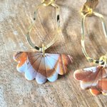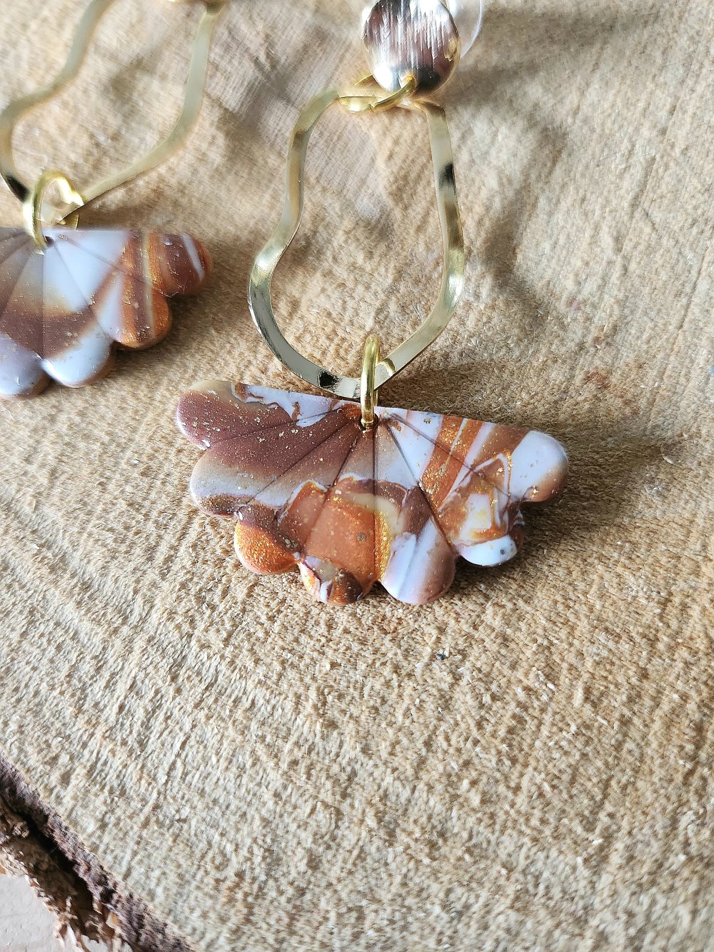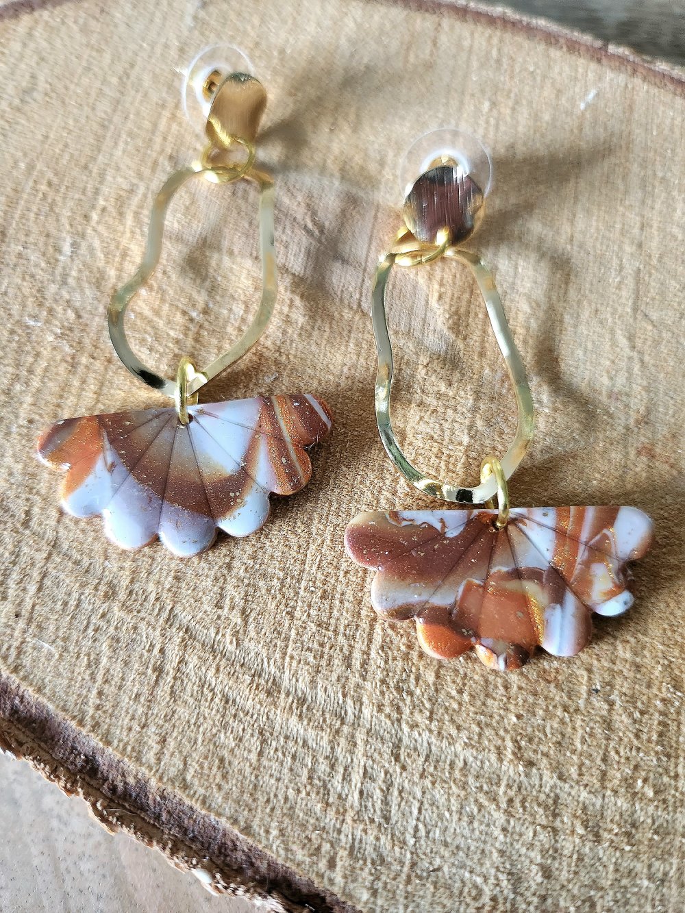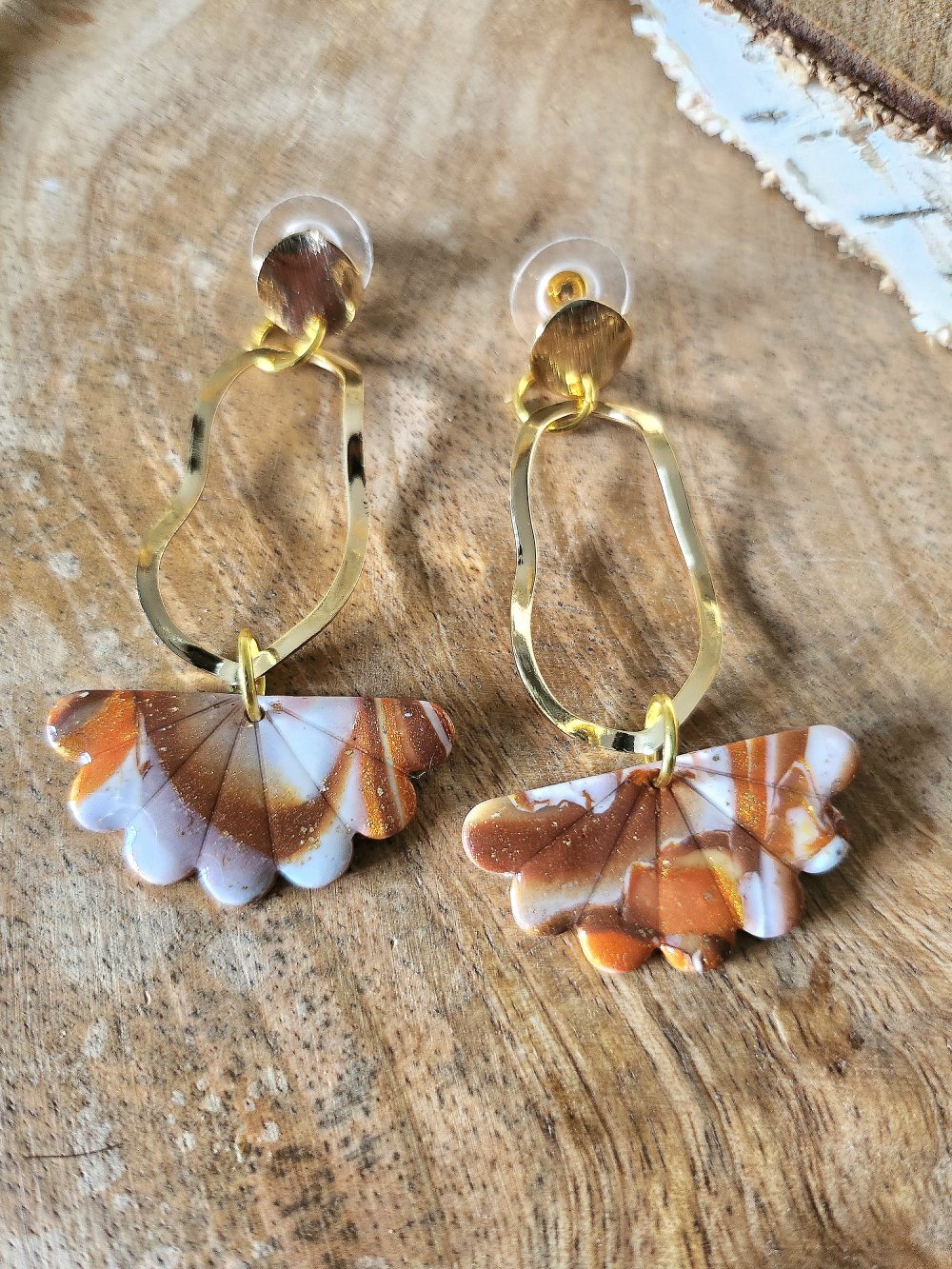 Boucles d'oreilles "horizon" faite mains en pate polymère pour la partie coloré et nuancé d'orange, blanc, marron. Le reste des pièces est en plaqué or (sauf les anneaux en métal doré simple).