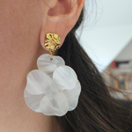 Boucles d'oreilles réalisés avec des pendentifs fleurs en relief en acétate 41 x40 mm marbré blanc.