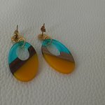 Création de boucles d'oreilles en résine jaune et bleu et bois de noyer (même couleur recto verso). Légères.