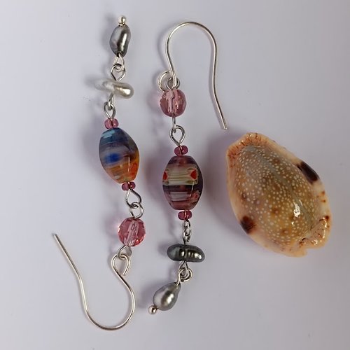 Boucles d'oreilles en argent 925 et petits keshis de Tahiti gris clair, composées chacune d'une perle millefiori aux tendres couleurs et d'une perle de verre facettée mauve