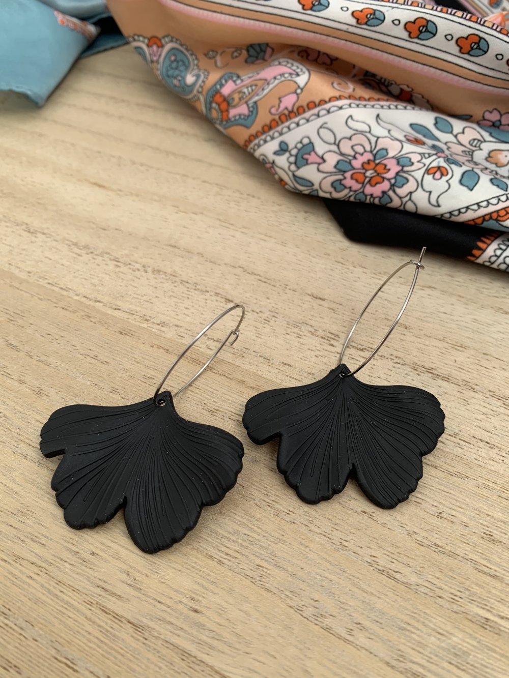 Boucles d’oreilles en acier inoxydable et feuille de ginkgo . Créole de environ 30 à 35 cm de diamètre.