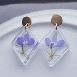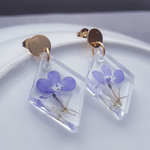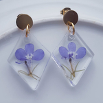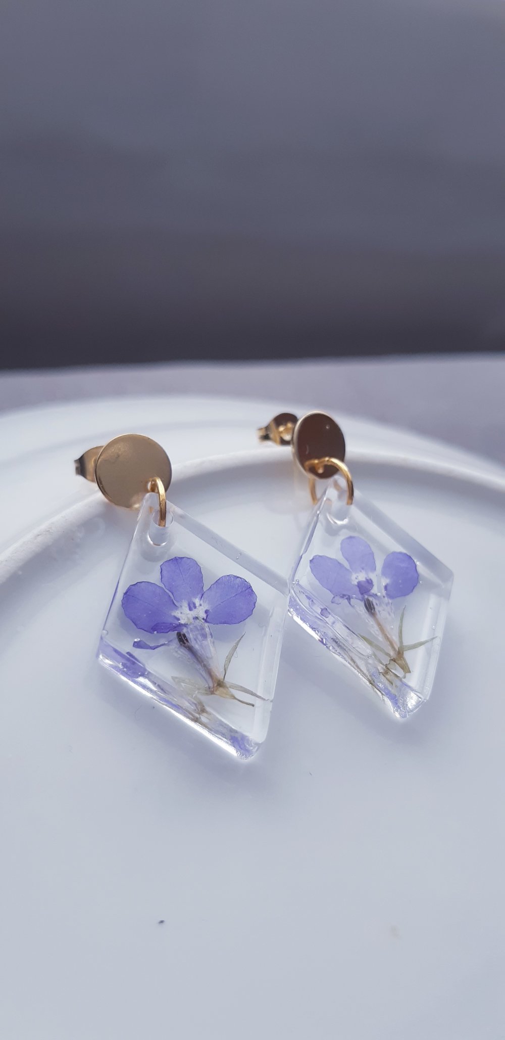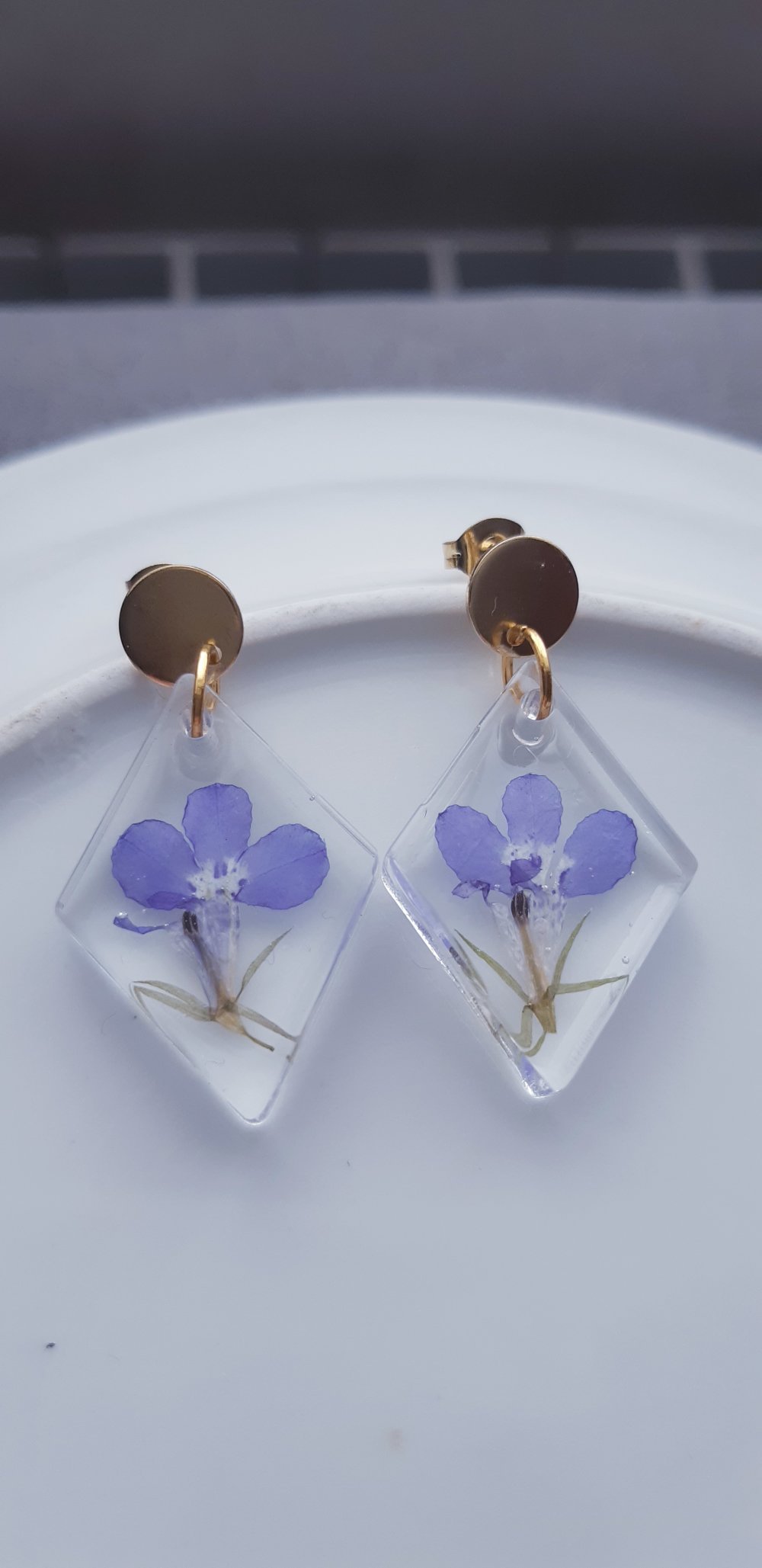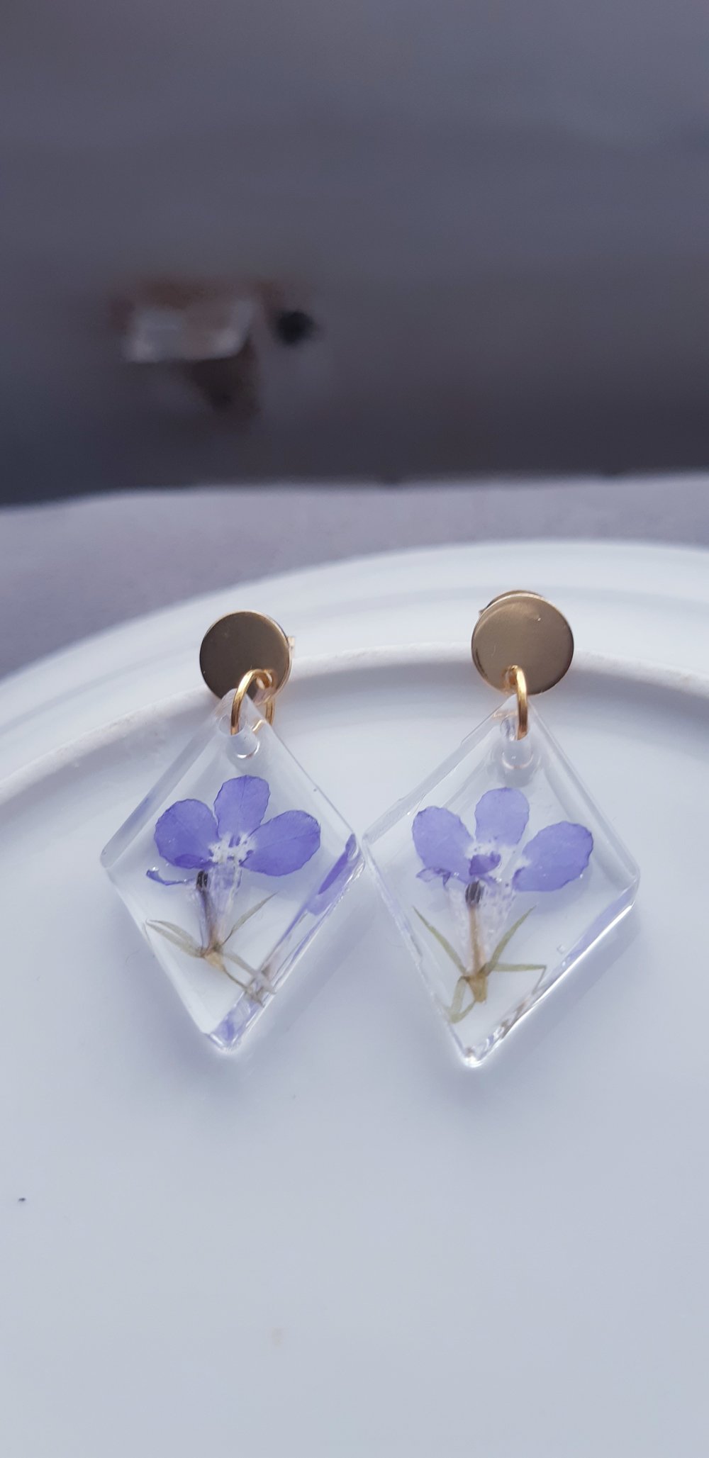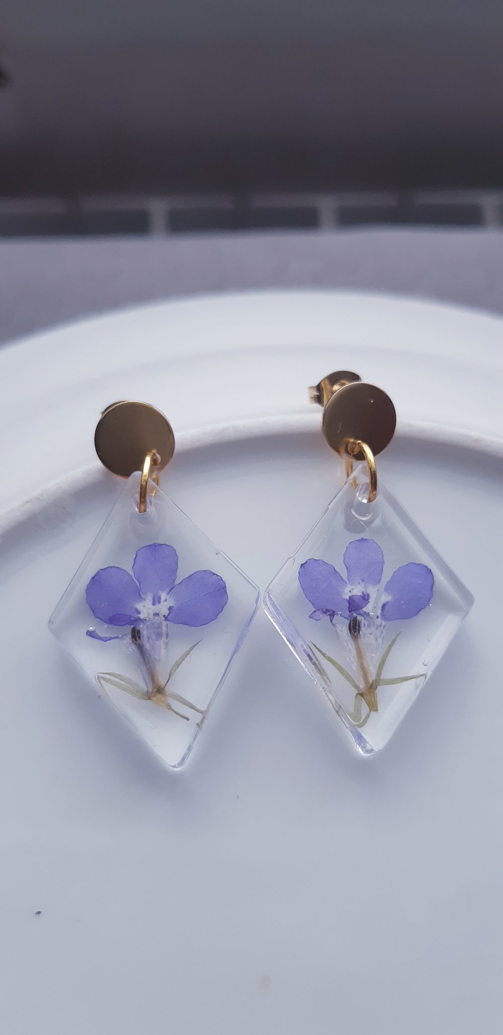Boucles d'oreilles losange résine fleur séchée lilas vert blanc et puces or - Idée cadeau femme