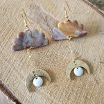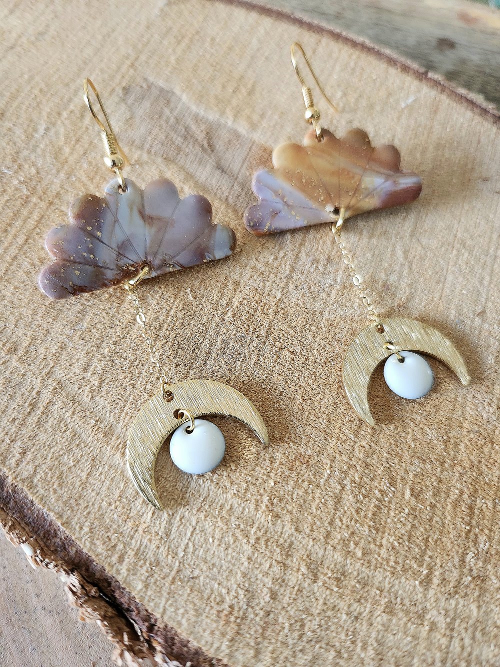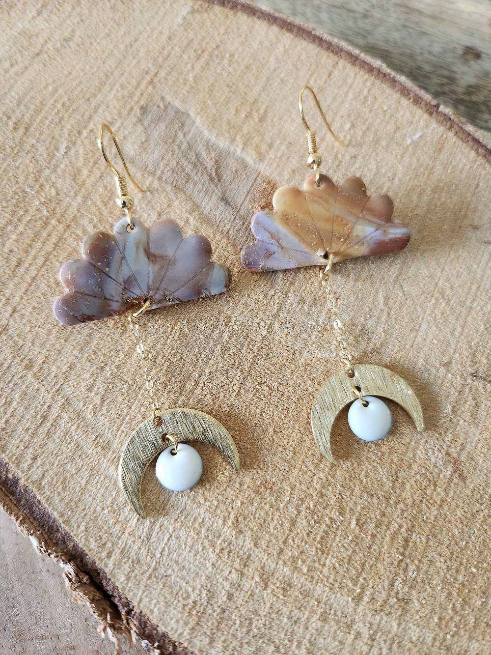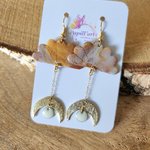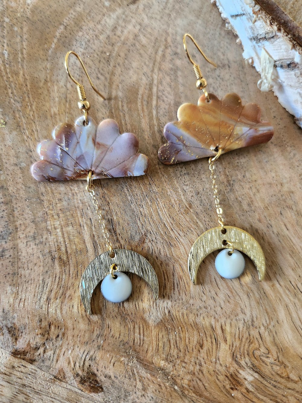 Création "luna" pour son coté lunaire et apaisant. Elles sont faite mains pour le coté "nuage" en pate polymère avec différentes nuances et des pointes de paillettes or.