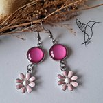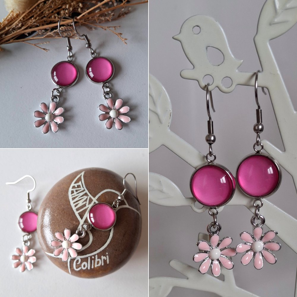 Elle est composée de cabochons en verre de 12mm ainsi que de fleurs argentées roses. Elles mesurent 5 cm.