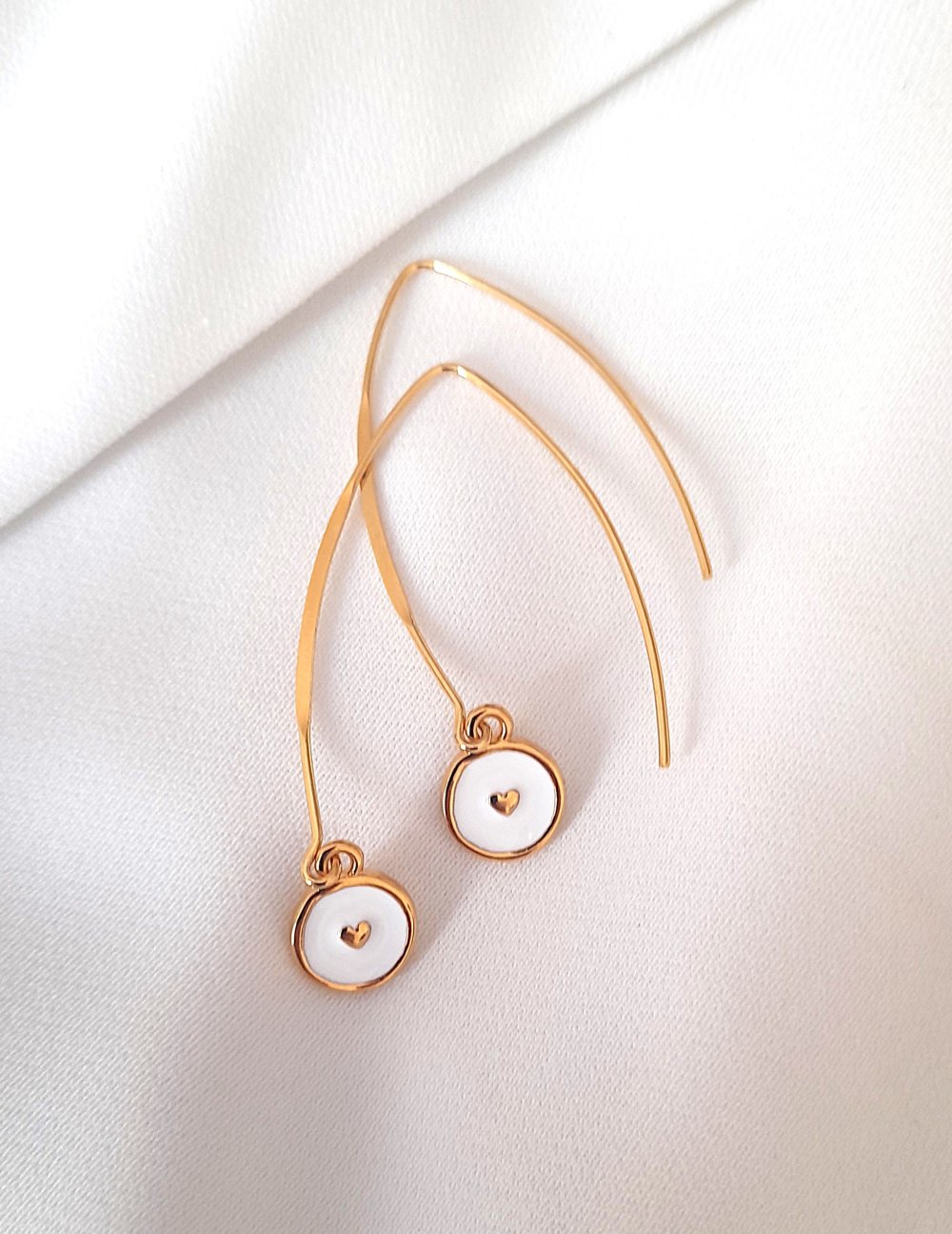 Très jolies boucles d'oreilles forme fil, de qualité, de longueur totale 52 mm et bien longue à l'arrière,tout en laiton recouvert d'or fin, et ornées d'un petit coeur sur fond blanc en résine, tout doré à l'arrière.