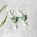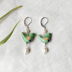 Les boucles d'oreilles en porcelaine oiseau vert sont uniques et adorables. J'ai associé des perles d'oiseau en céramique verte à de véritables perles d'eau douce en forme de riz.