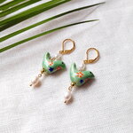 Boucles d'oreilles oiseau vert en porcelaine | Boucles d'oreilles en céramique colorée | Boucles d'oreilles pendantes animal avec perles d'eau douce | Boucles d'oreilles délicates en or vert