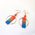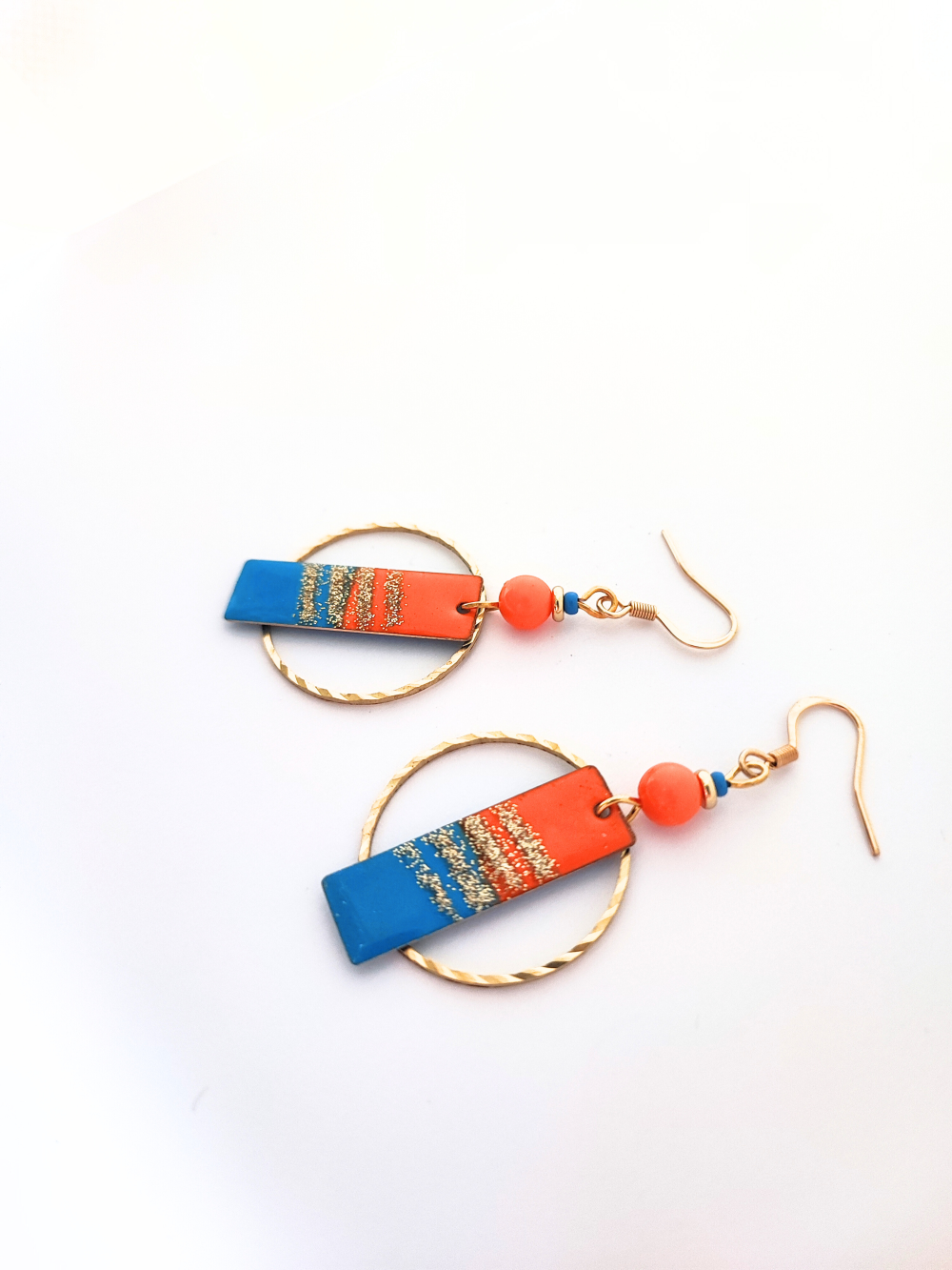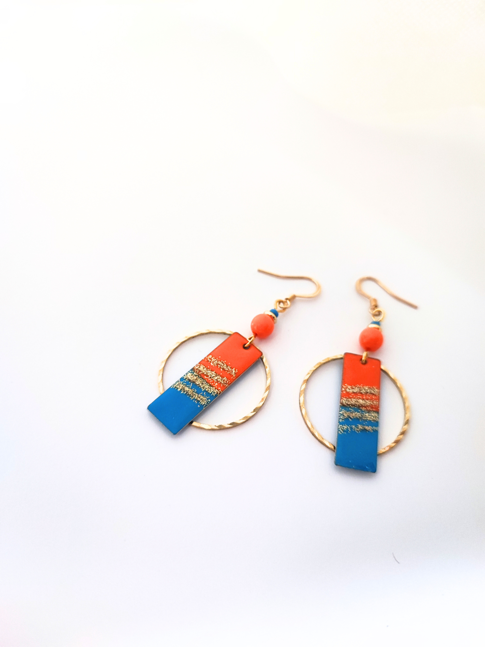 Boucles d'oreilles originales et festives, bleu, orange et doré, idée cadeau femme
