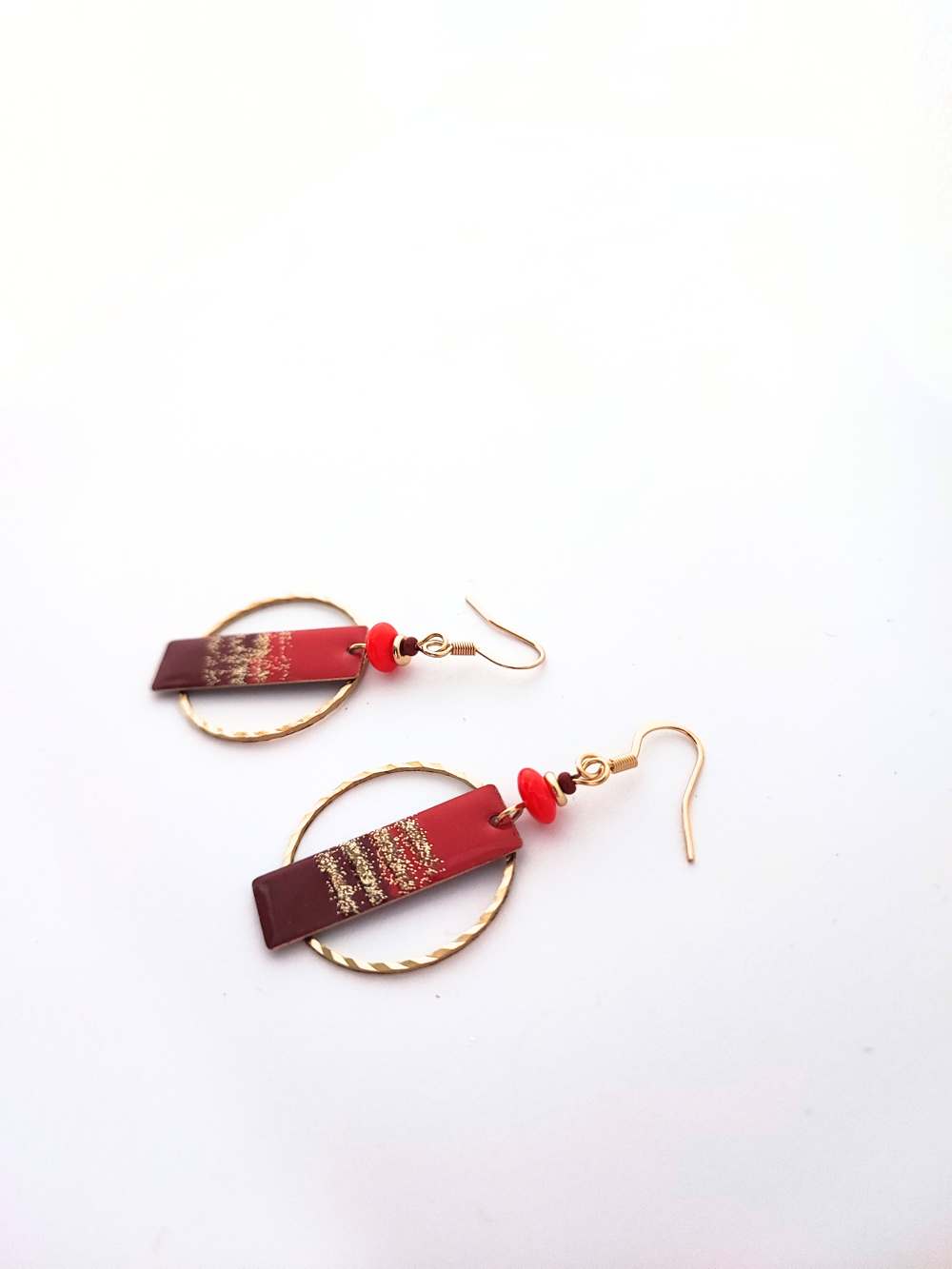 Boucles d'oreilles originales & festives, en acier inoxydable et émail rouge clair et foncé.