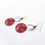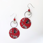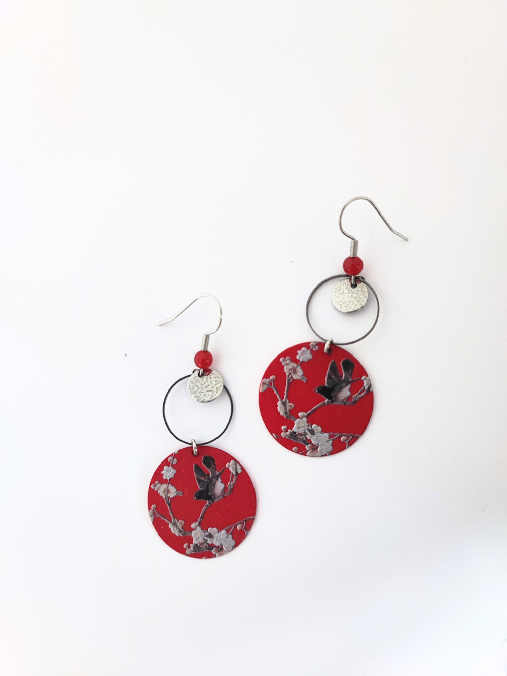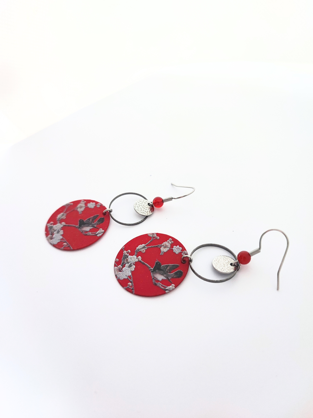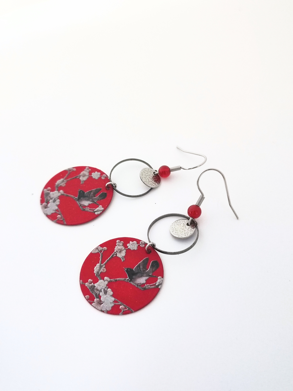 Boucles d’oreilles motifs ouiseaux sur fond rouge foncé, en acier inoxydable.