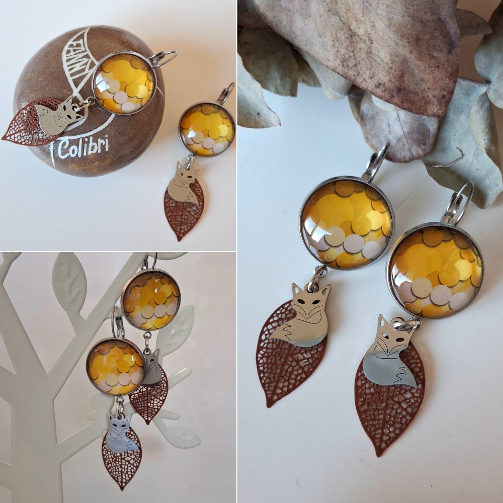 Elle est composée de cabochons en verre de 20 mm, de feuilles émaillées marrons et de jolis renards en acier inoxydable. La paire mesure 6 cm.