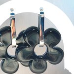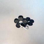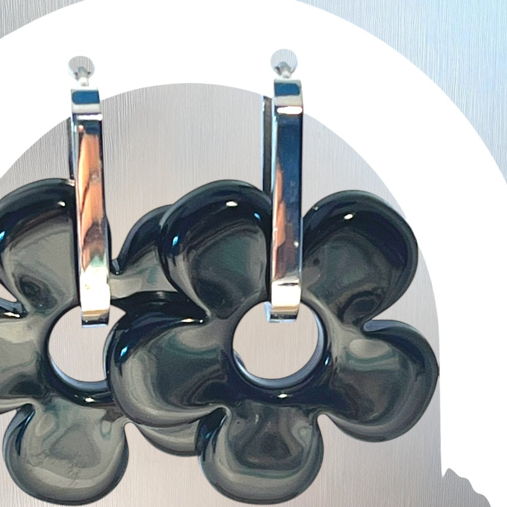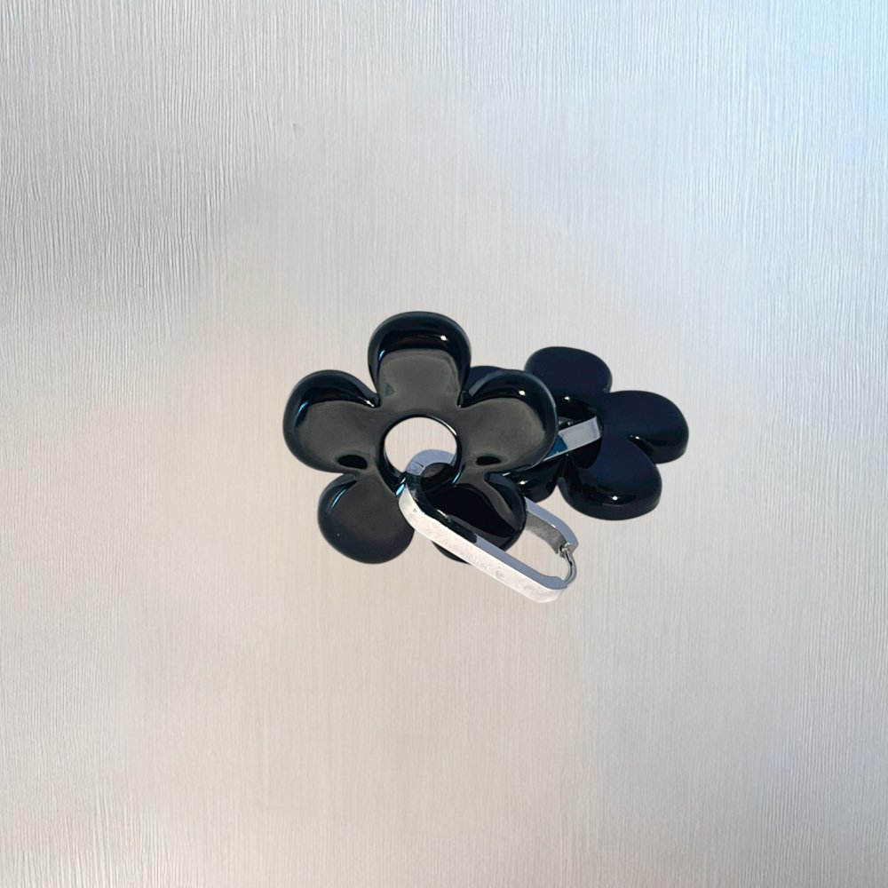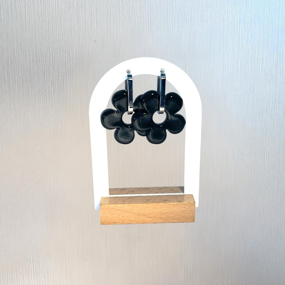 Boucles d’oreilles artisanales composées d’une pampille fleur noire en résine brillante suspendue à une créole ovale argentée. Un bijou chic, léger et facile à porter au quotidien.