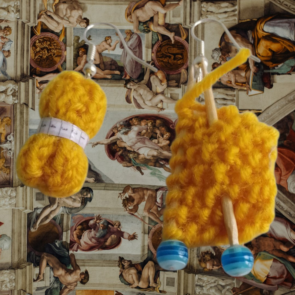 Boucles d'oreilles en pelotes de laine avec tricot entamé.