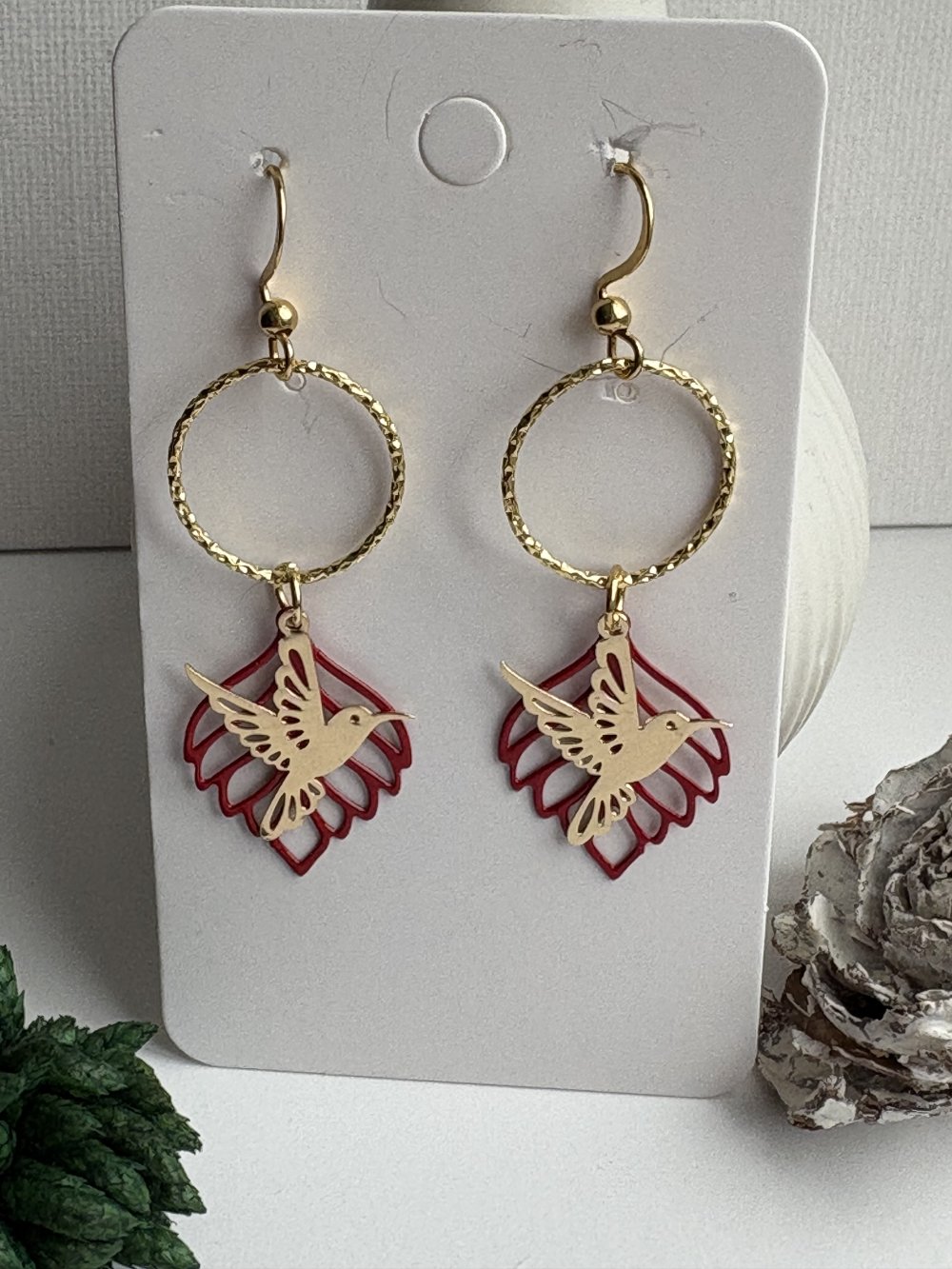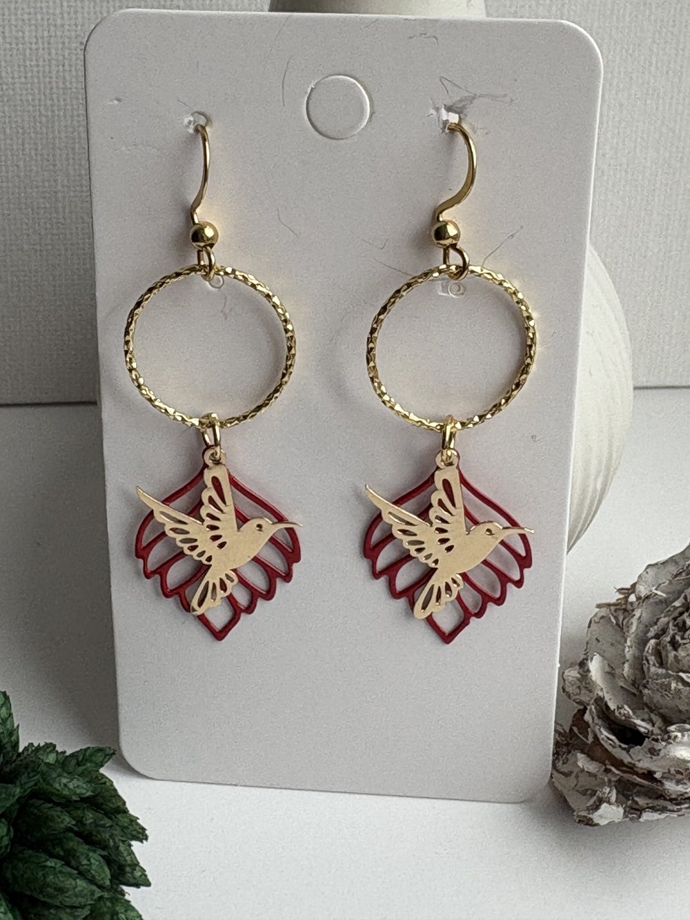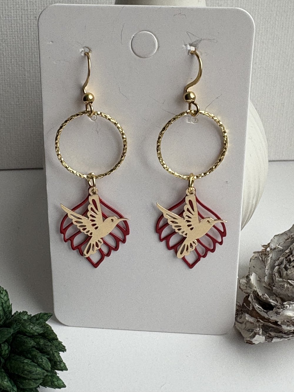 - feuille rouge et pendentif colibri doré