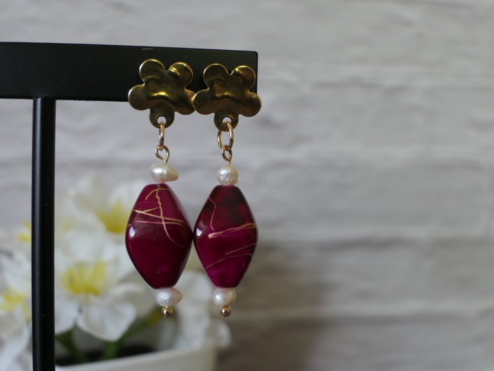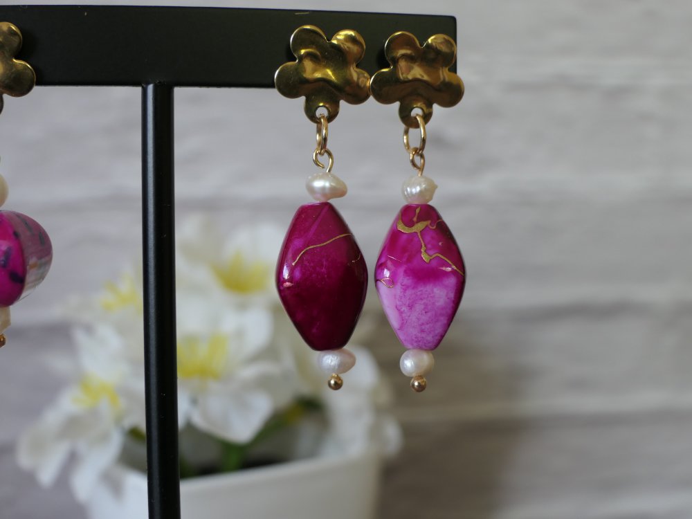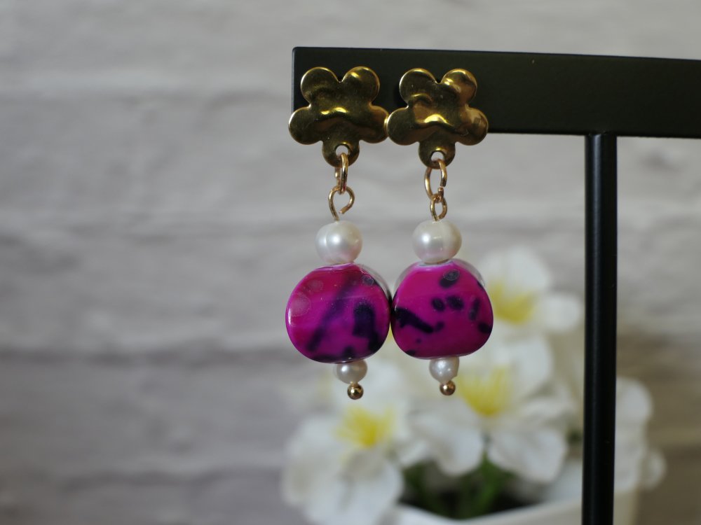 Boucles d’oreilles pendantes fleuries – Acier inoxydable doré & perles d’acrylique