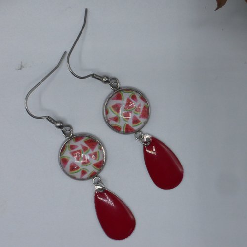 boucles d'oreilles pendantes pastèque été rouge vert blanc en cabochon en verre et acier inoxydable