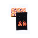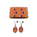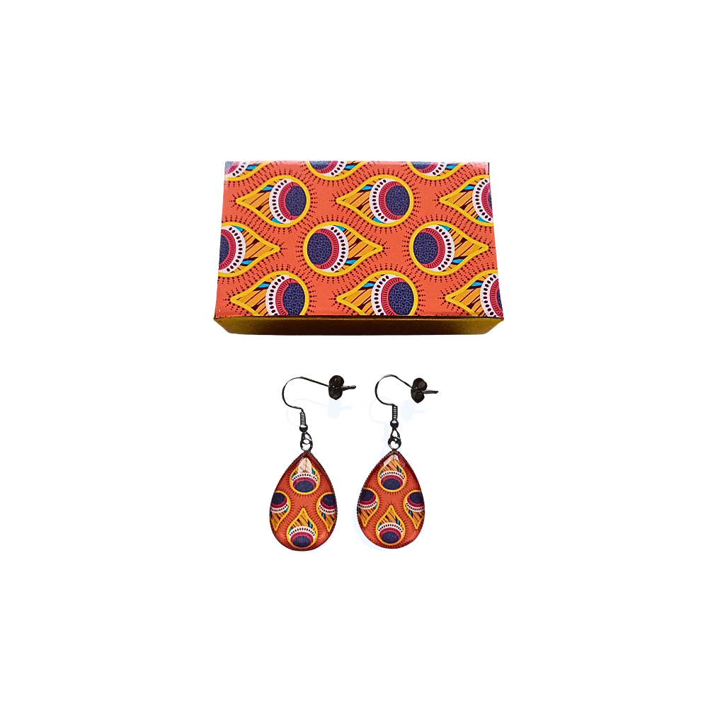 Offrez un bijou unique et fait main avec ce coffret cadeau contenant une paire de boucles d’oreilles pendantes avec un motif wax africain.