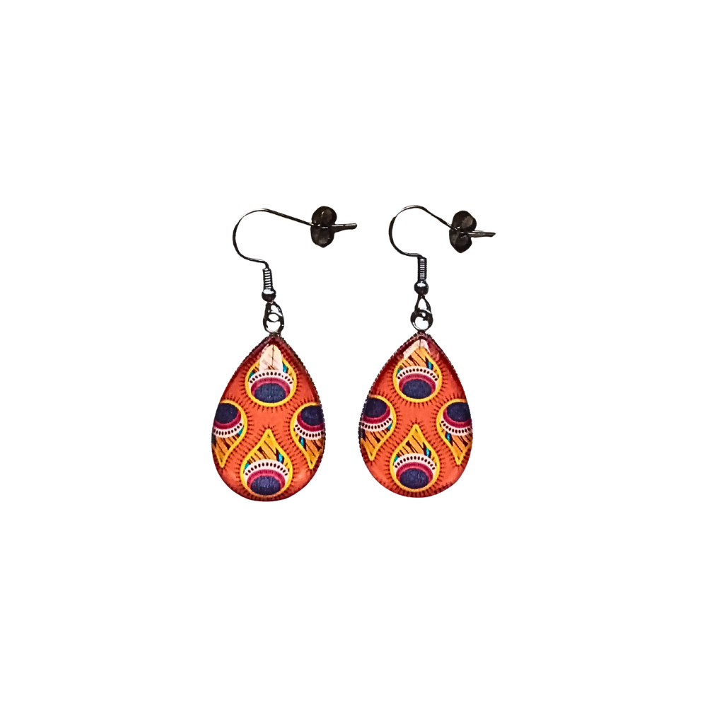 Le design ethnique et coloré orangé est sublimé par un cabochon en verre, monté sur un support en acier inoxydable.