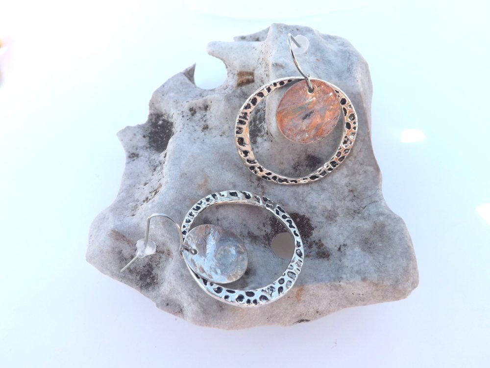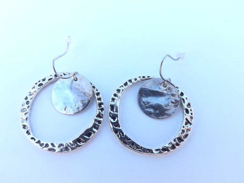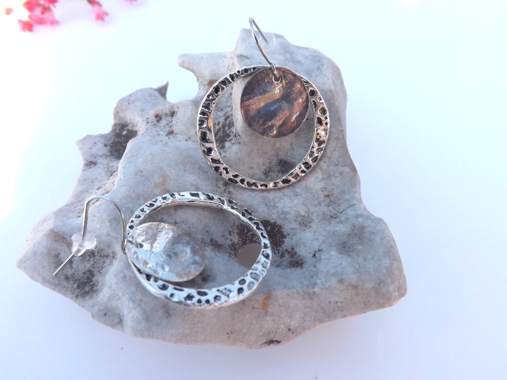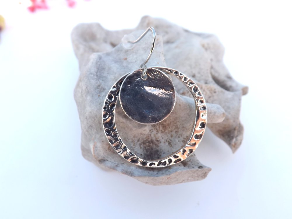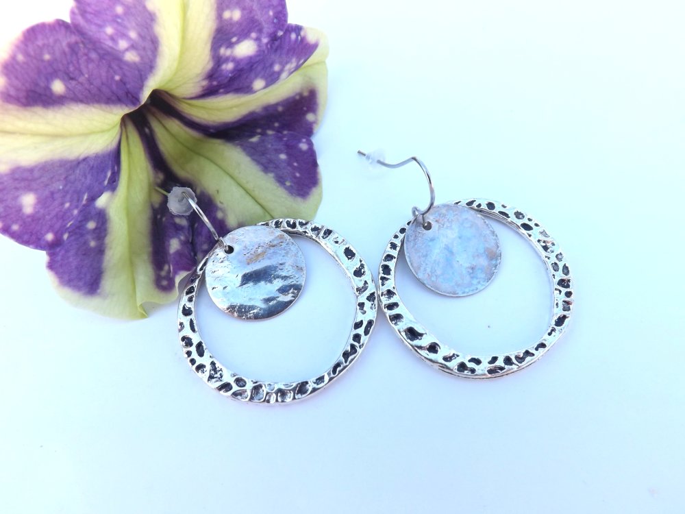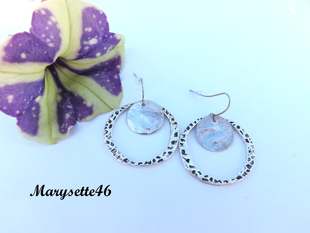 Raffinées ces boucles d'oreilles en métal argenté au sequin martelé de 15 mm lové dans un anneau martelé de 30 x 28 mm.