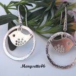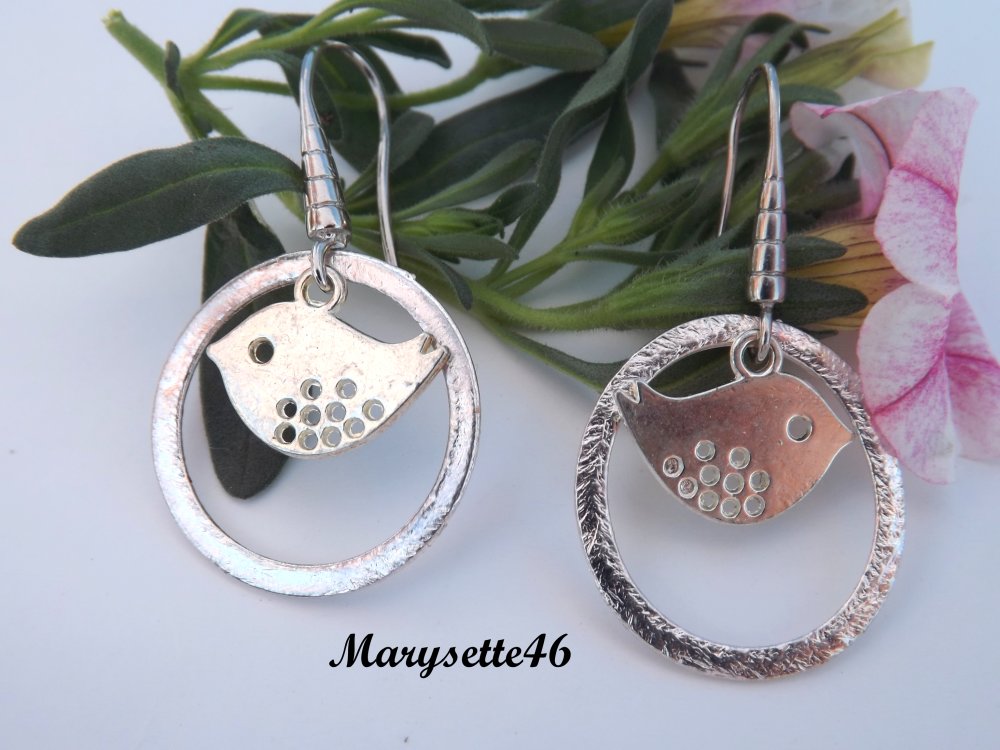 Boucles d'oreilles à anneau de 22 mm et breloque oiseau de16x13 en métal argenté