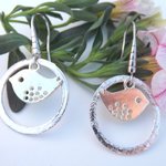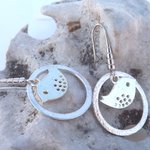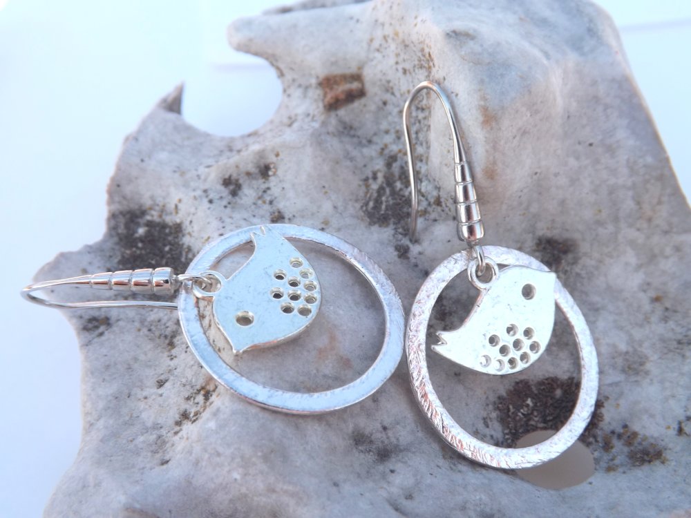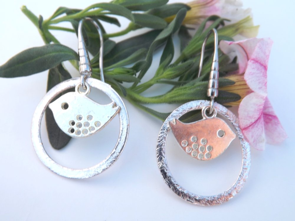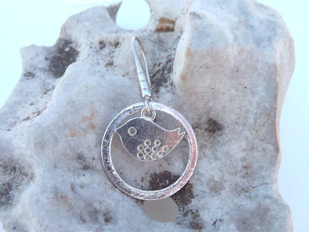 Subtiles boucles d'oreilles aux crochets en laiton à breloque oiseau en métal argenté de 16 x 13 mm lové dans un anneau martelé de 22 mm.