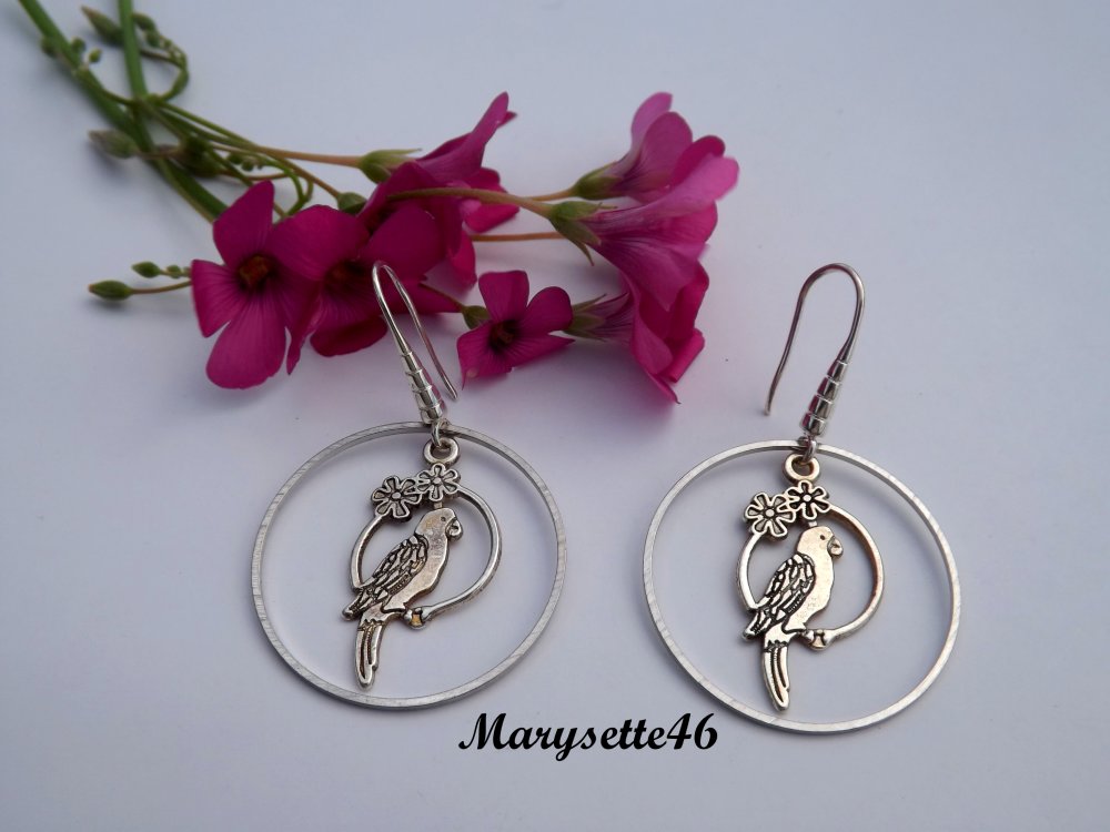 Boucles d'oreilles à anneau laiton de 30 mm et breloque perroquet de 28x15 en métal argenté