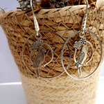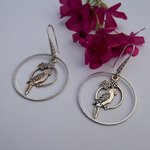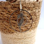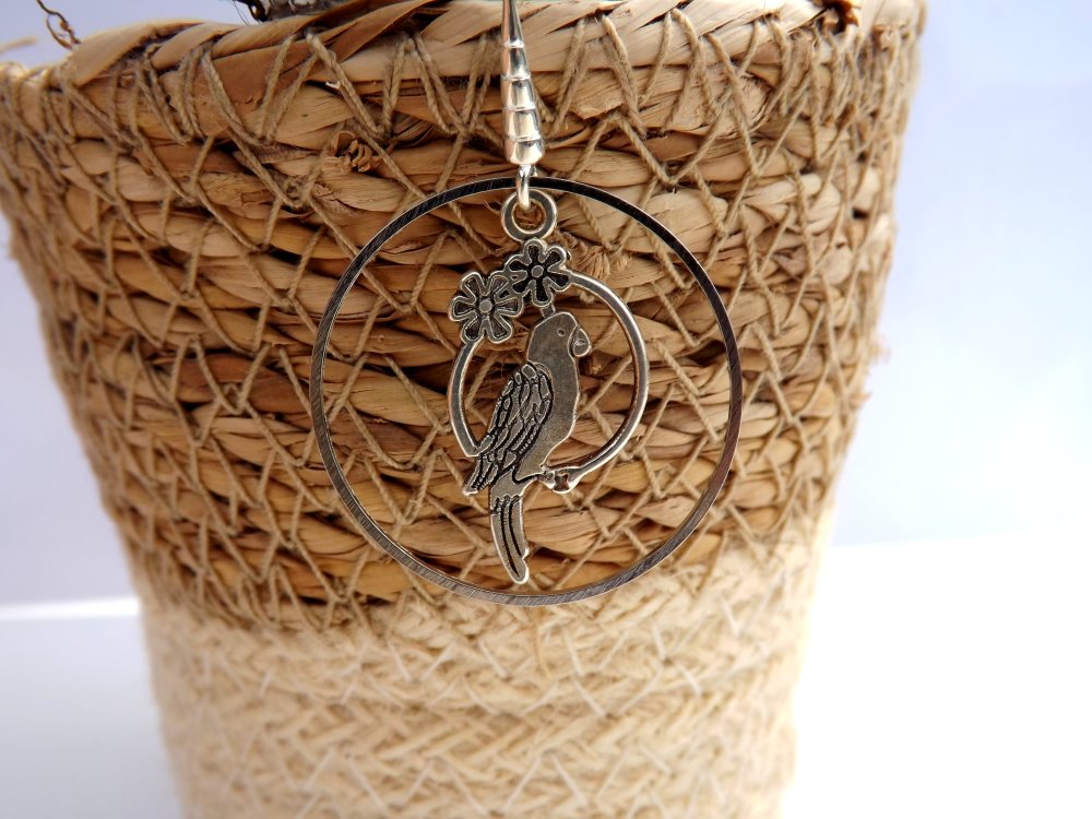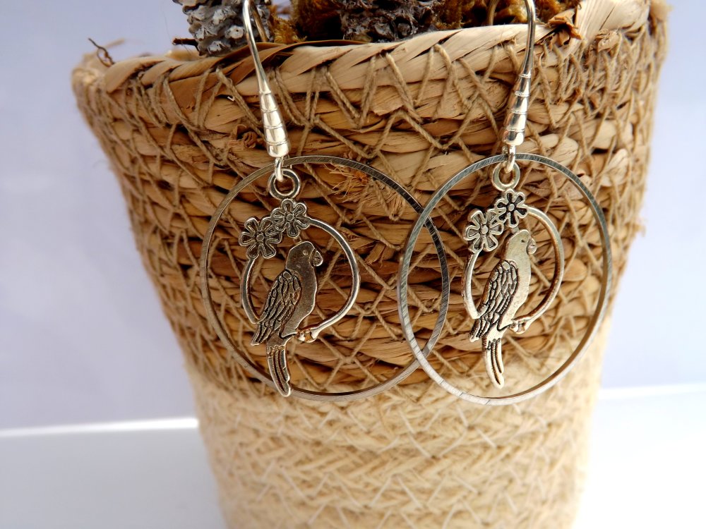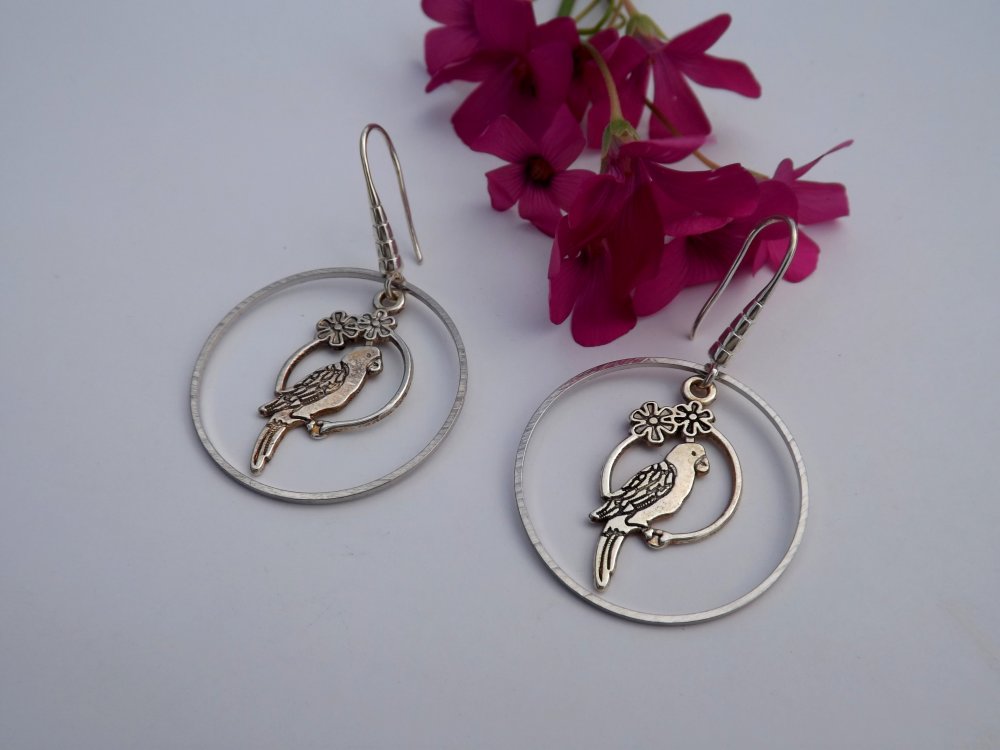 Subtiles boucles d'oreilles aux crochets en laiton à breloque perroquet en métal argenté de 28 x 15 mm lové dans un anneau laiton de 30 mm.