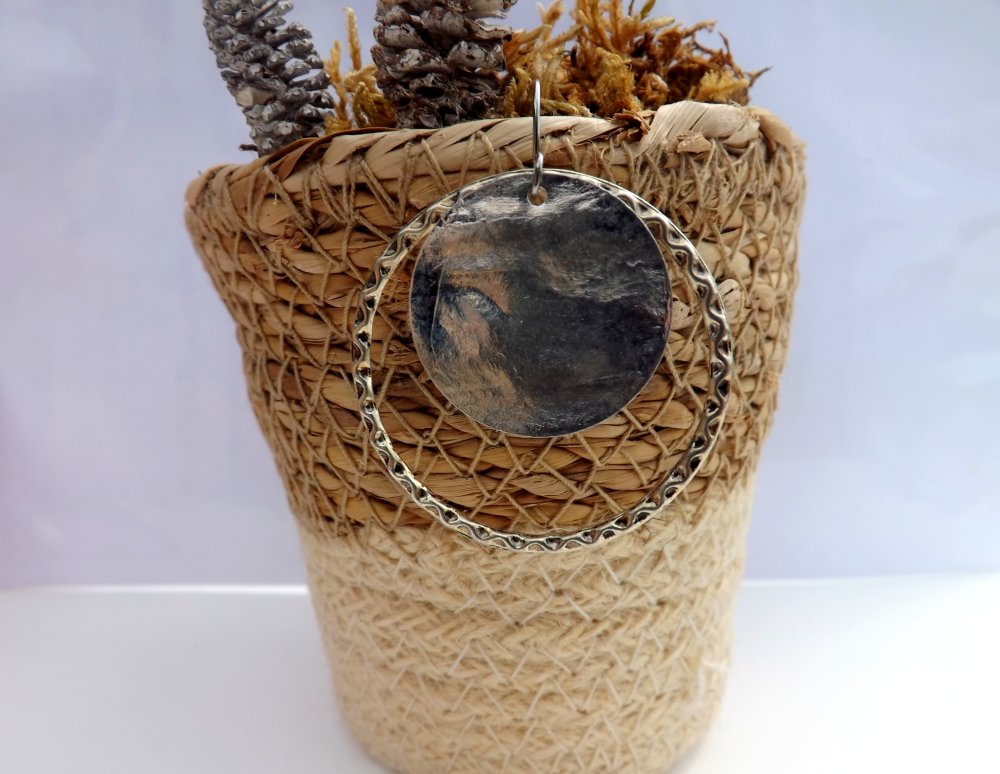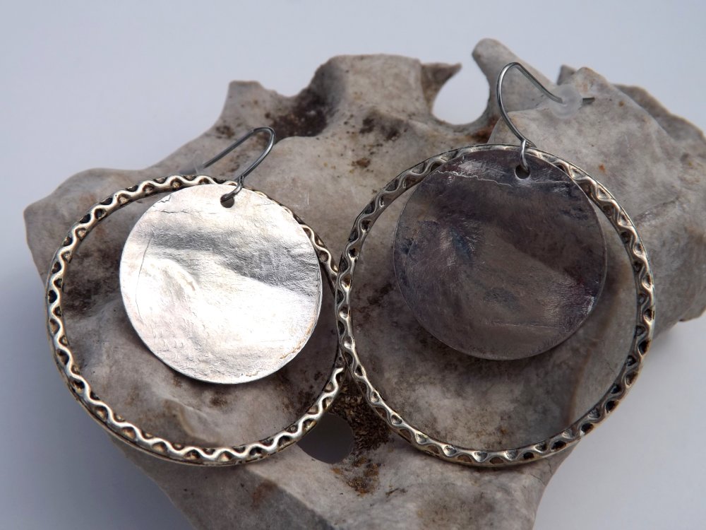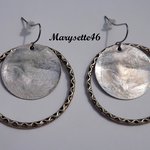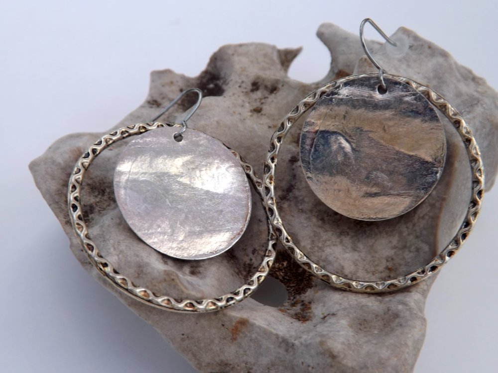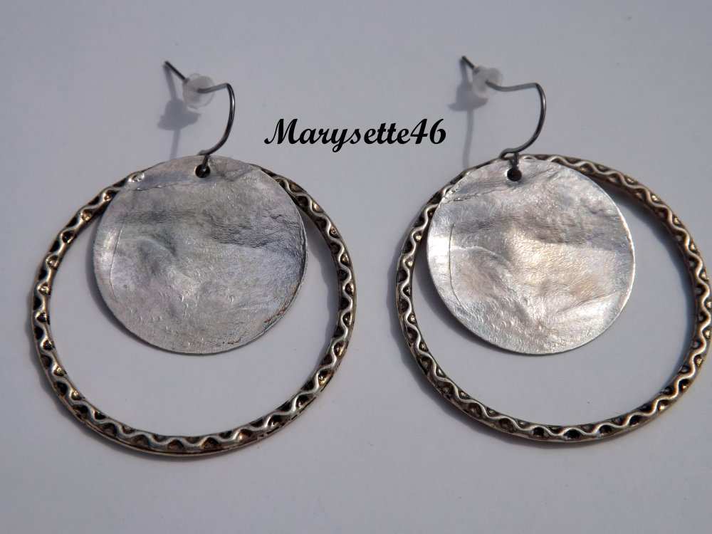 Raffinées ces boucles d'oreilles au sequin aspect froissé de 25 mm en laiton et anneau martelé de 40 mm en métal argenté.