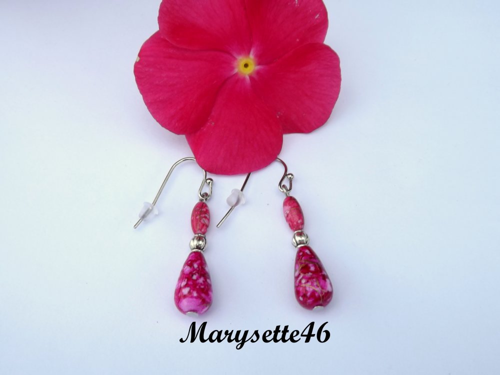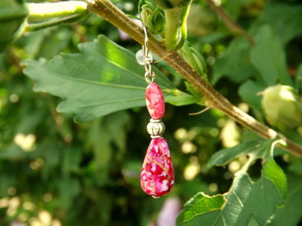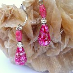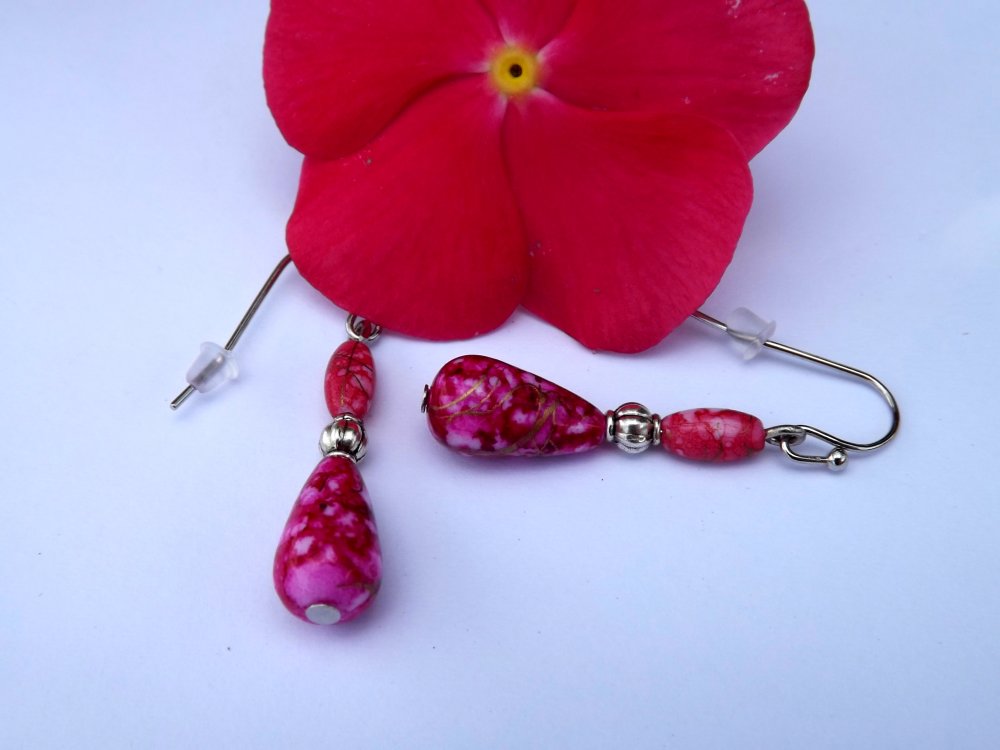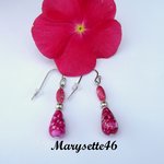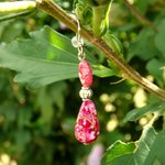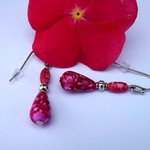 Délicates boucles d'oreilles aux perles ovale 8 x 3 mm et goutte 6 x 12 mm acrylique nuancées de rose/rouge/violet/doré où est insérée entre elles une perle lanterne de 4 mm.