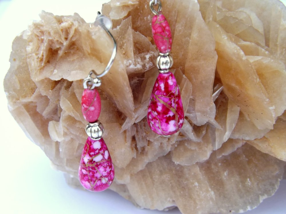 Boucles d'oreilles pendantes aux perles ovale et goutte nuancées rose/rouge/violet/doré avec perle lanterne et apprêts en métal argenté