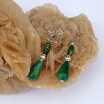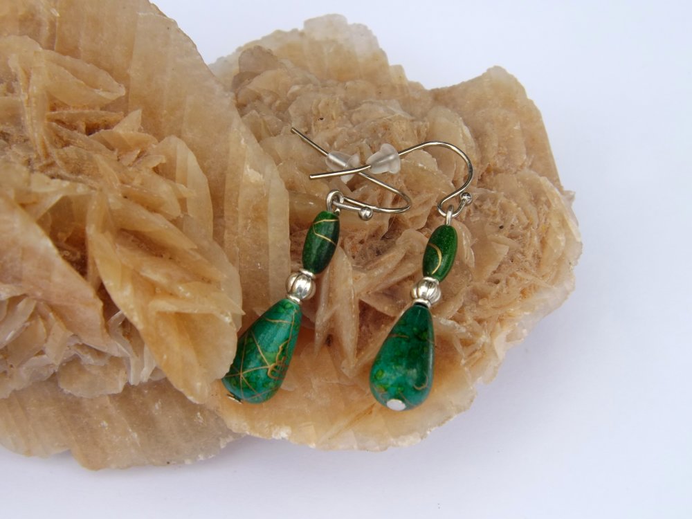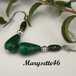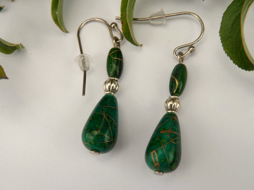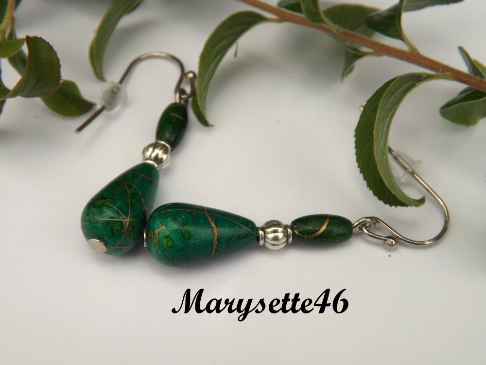 Délicates boucles d'oreilles aux perles ovale 8 x 3 mm et goutte 6 x 12 mm acrylique nuancées de vert/doré où est insérée entre elles une perle lanterne de 4 mm.